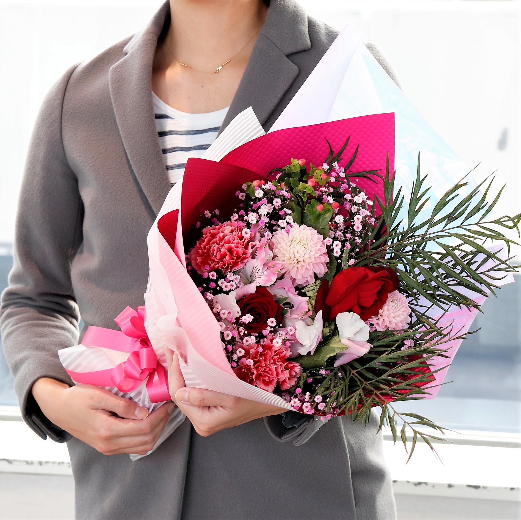 月の誕生花を取り入れた【karendo】のバースデーブーケ。華やかにラッピングし、大事な人にお届けします。