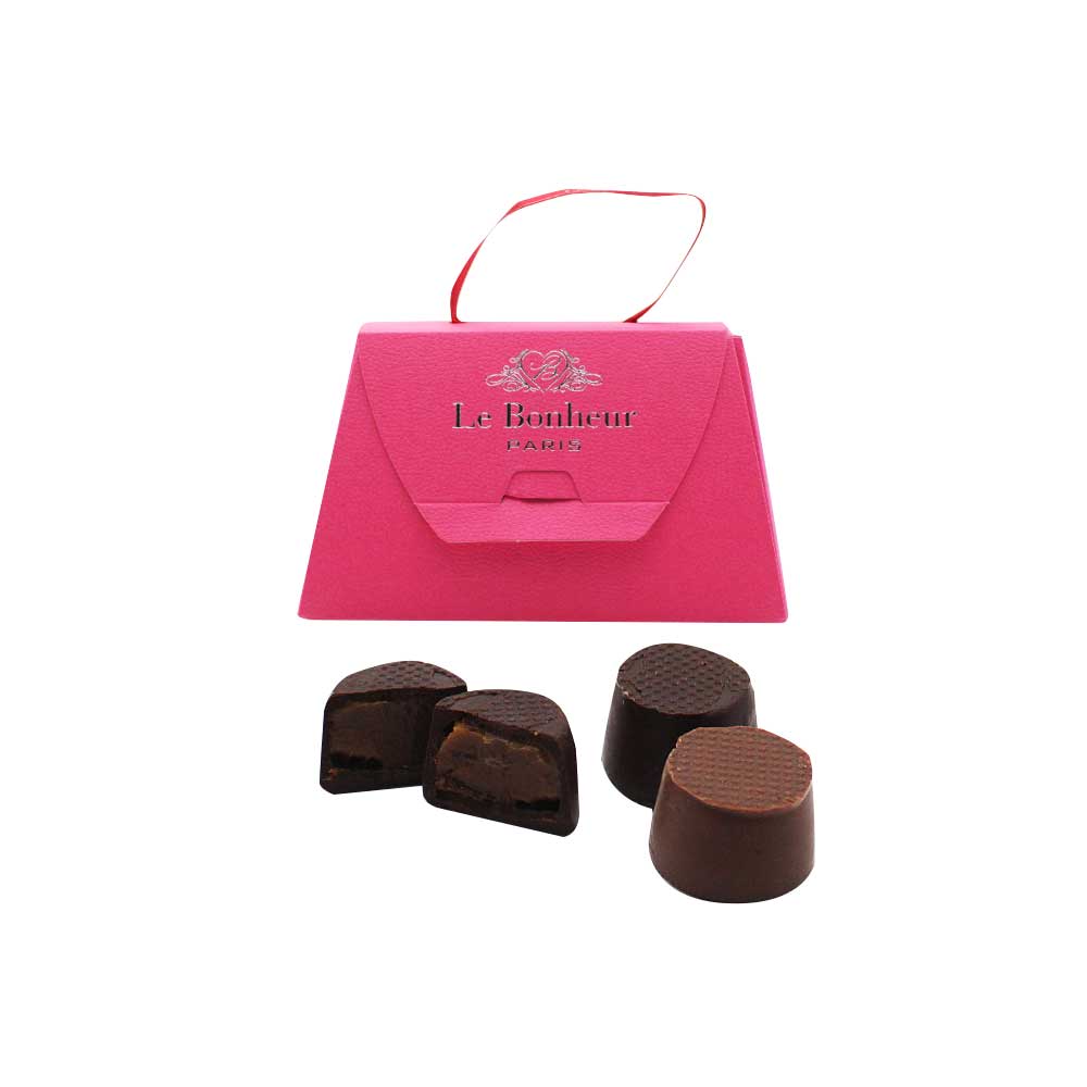 ピンクのハンドバッグ型のパッケージに3粒(ビター2粒/ミルク1粒)をセットしてお届けします。バッグ型なのでそのままお渡しもOKです。 「ありがとう」や「おめでとう」など、日ごろの気持ちを伝える手土産品としても最適です。