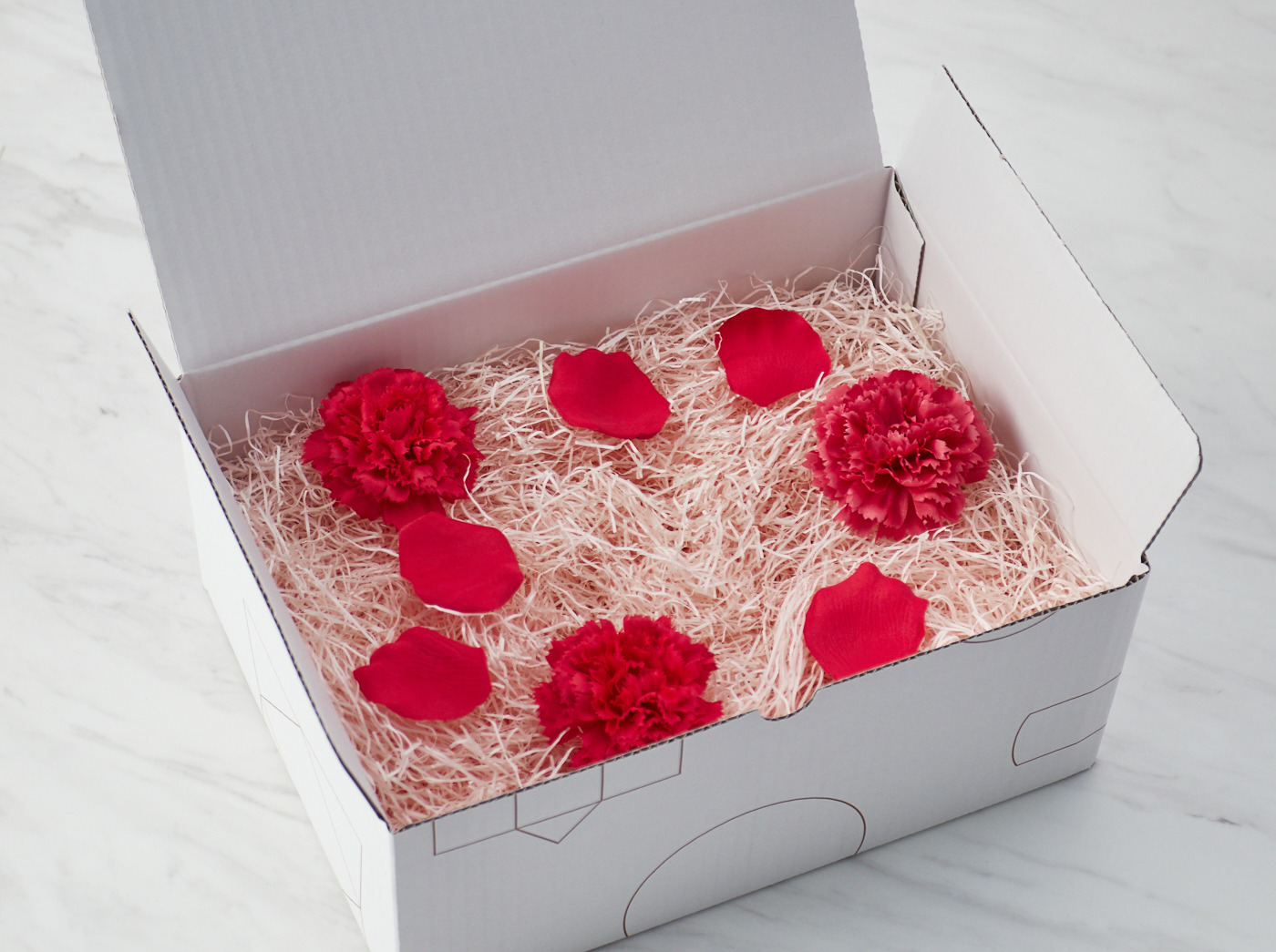 母の日ギフトを直接お母様へ贈る方におすすめ! 段ボールを開けた瞬間からサプライズを演出できる人気オプション「段ボール装飾」に母の日特別バージョンが登場。 カーネーションと花びらでギフトを華やかに彩ります。