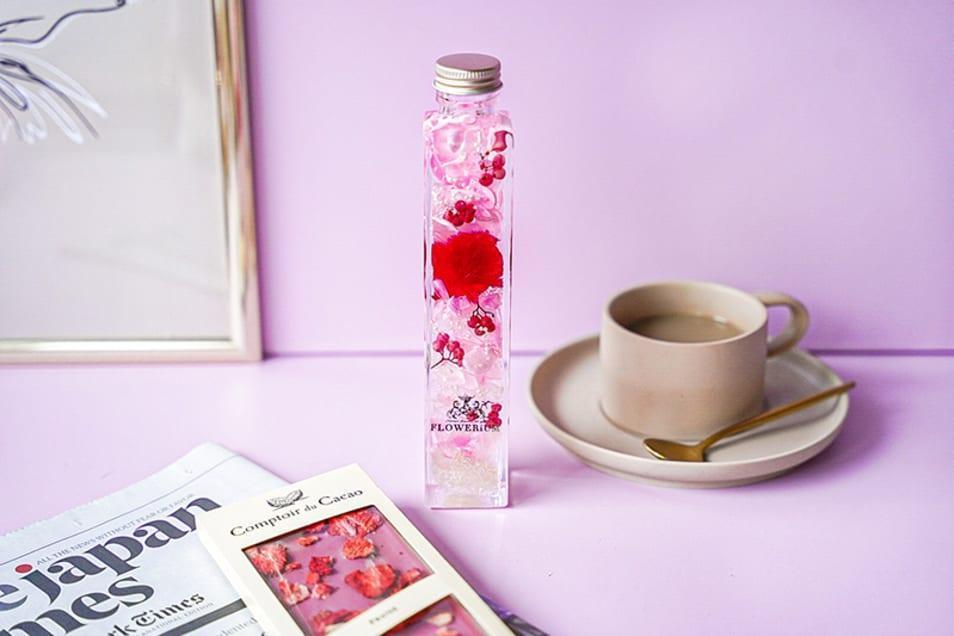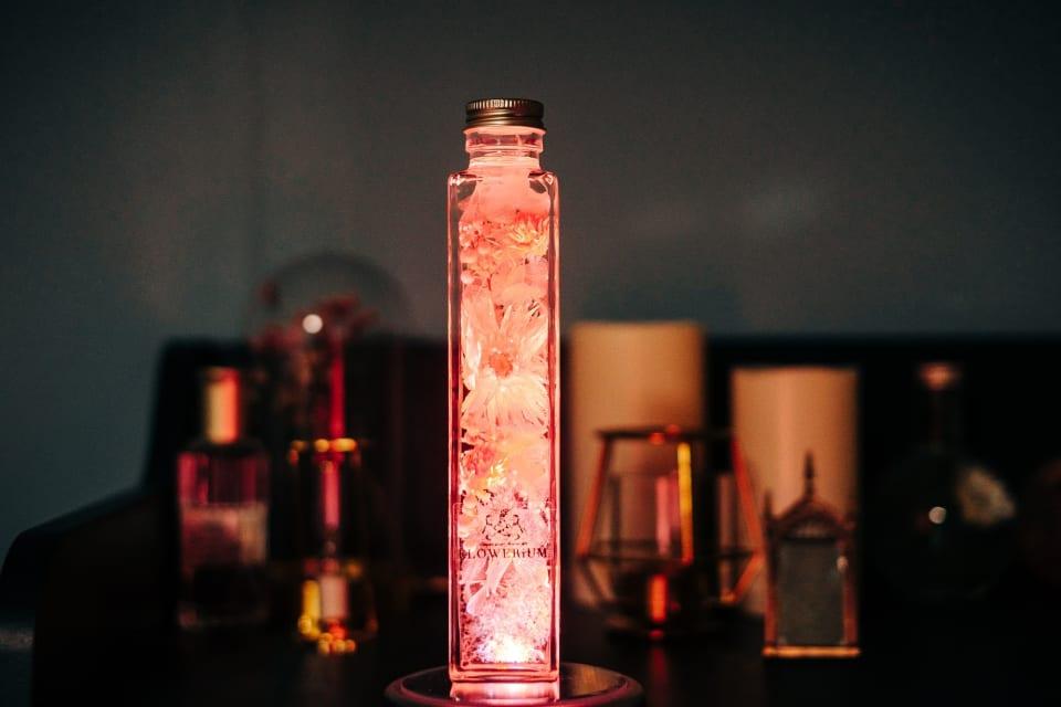 スリムでスマートな形は、飾る場所を選ばず空間を華やかに彩ってくれます。ボトルを上下にひっくり返したり、傾けたりすればガラスの中では花たちがゆっくりと優しく揺れ動きます。光が通過する度に葉脈が透き通り、キラキラと美しく輝きます。みずみずしさと鮮やかさを得た、生け花とは違う新しい命を吹き込まれた花々をお楽しみください。