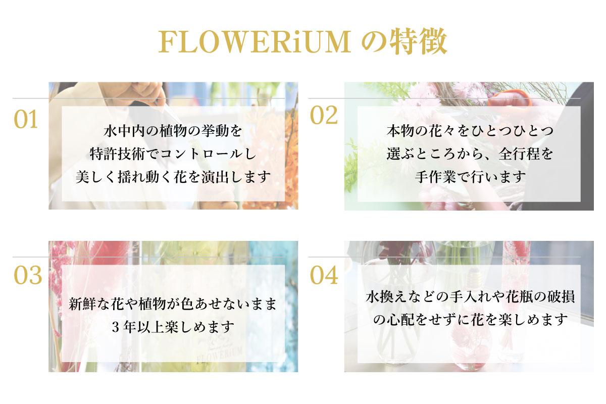 FLOWERiUM®︎とは、特許技術によりみずみずしい花々を長期間楽しむことができる美しいフラワーアレンジメントです。本物の花々をひとつひとつ選ぶところから、全行程を手作業で行い、水中内の植物の挙動を科学技術でコントロールし美しく揺れ動く花を演出します。水換えなどの手入れや花瓶の破損の心配をせずに、新鮮な花を色あせないまま3年以上楽しめます。