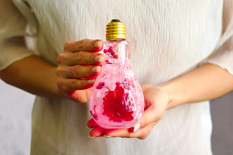 大口注文・法人のお問い合わせはこちら電球型ボトルの中にプリザーブドフラワーなどの花々を、ギュッと詰め込んだキュートなフラワリウムです。 プレゼントにぴったりな色合いとデザインは、お相手に喜ばれること間違え無し◎お手入れいらずでキラキラと光の当たり方で雰囲気もいろいろ・・・お手軽に花のある暮らしを楽しめて素敵!