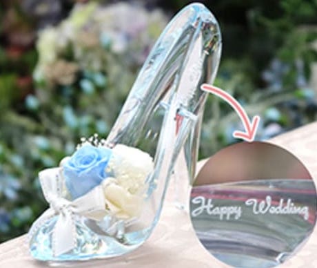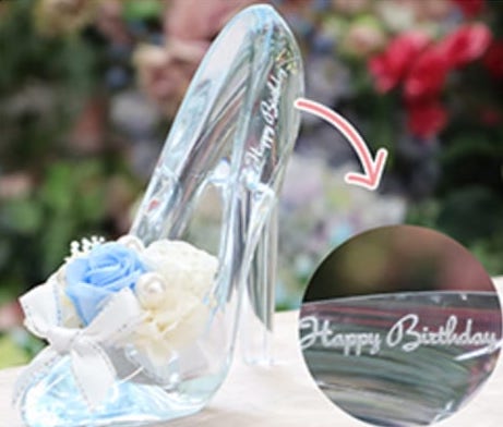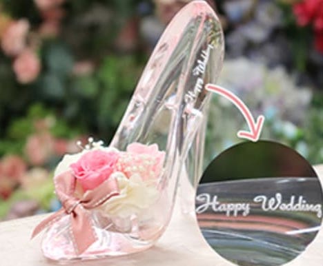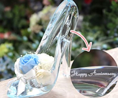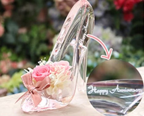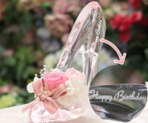 女性の憧れシンデレラとプリザードフラワーのコラボレーション。プリザーブドフラワーは水やりの必要がなく、半年~1年は充分綺麗な状態で楽しめます。お部屋に置いても可愛く、花粉も飛ばないため誕生日プレゼントなどの特別な日の贈り物としておすすめです。女性なら1度は憧れたガラスの靴は絶対に喜ばれます!!※彫刻の文言追加・変更は承っておりません。
