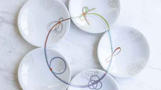 大口注文・法人のお問い合わせはこちら長い歴史のある水引には、見た目だけでなく贈る相手を思いやる気持ちがあらわれています。そんな日本の伝統デザインを使った「銘々皿」は、縁起物としても贈って喜ばれる素敵なお皿に◎