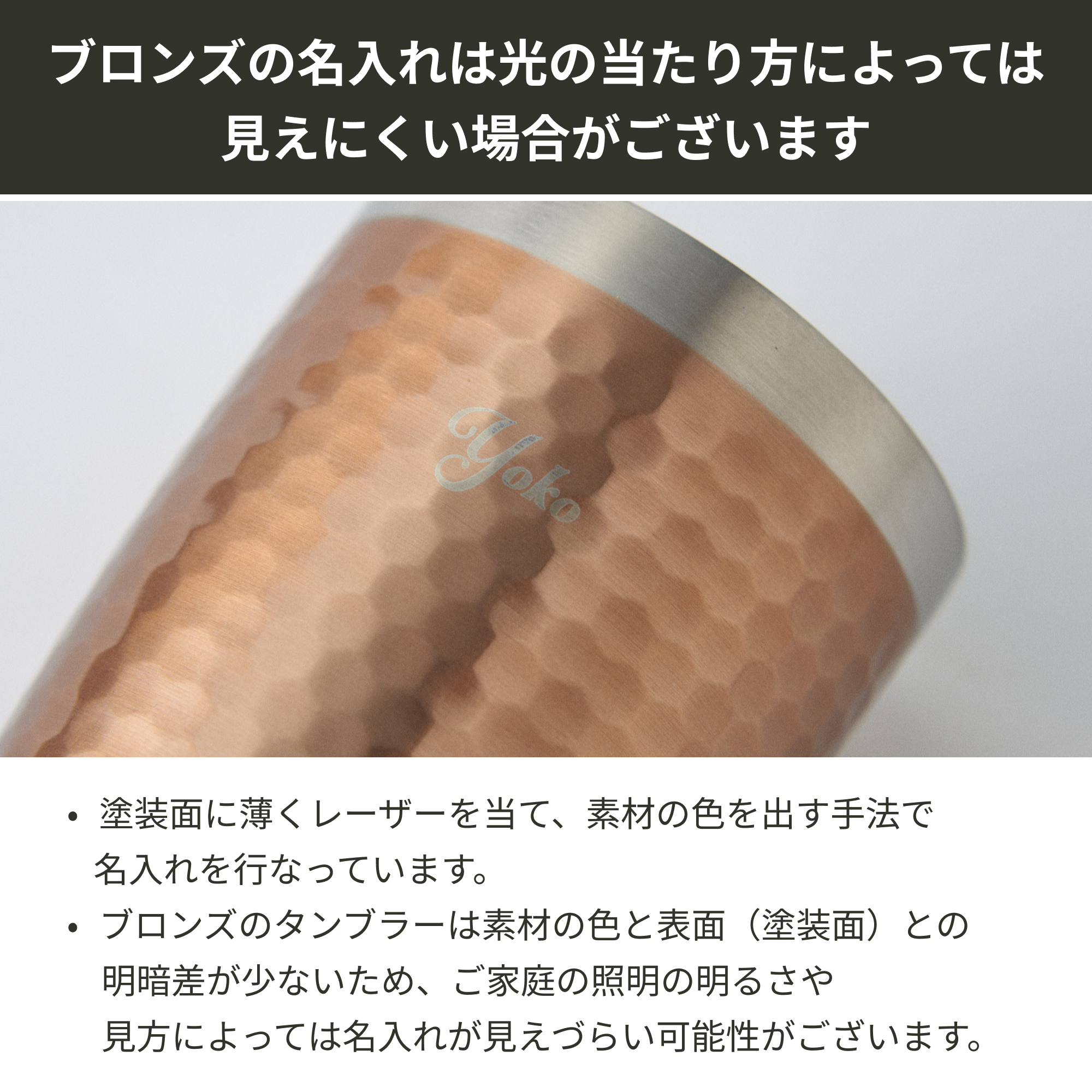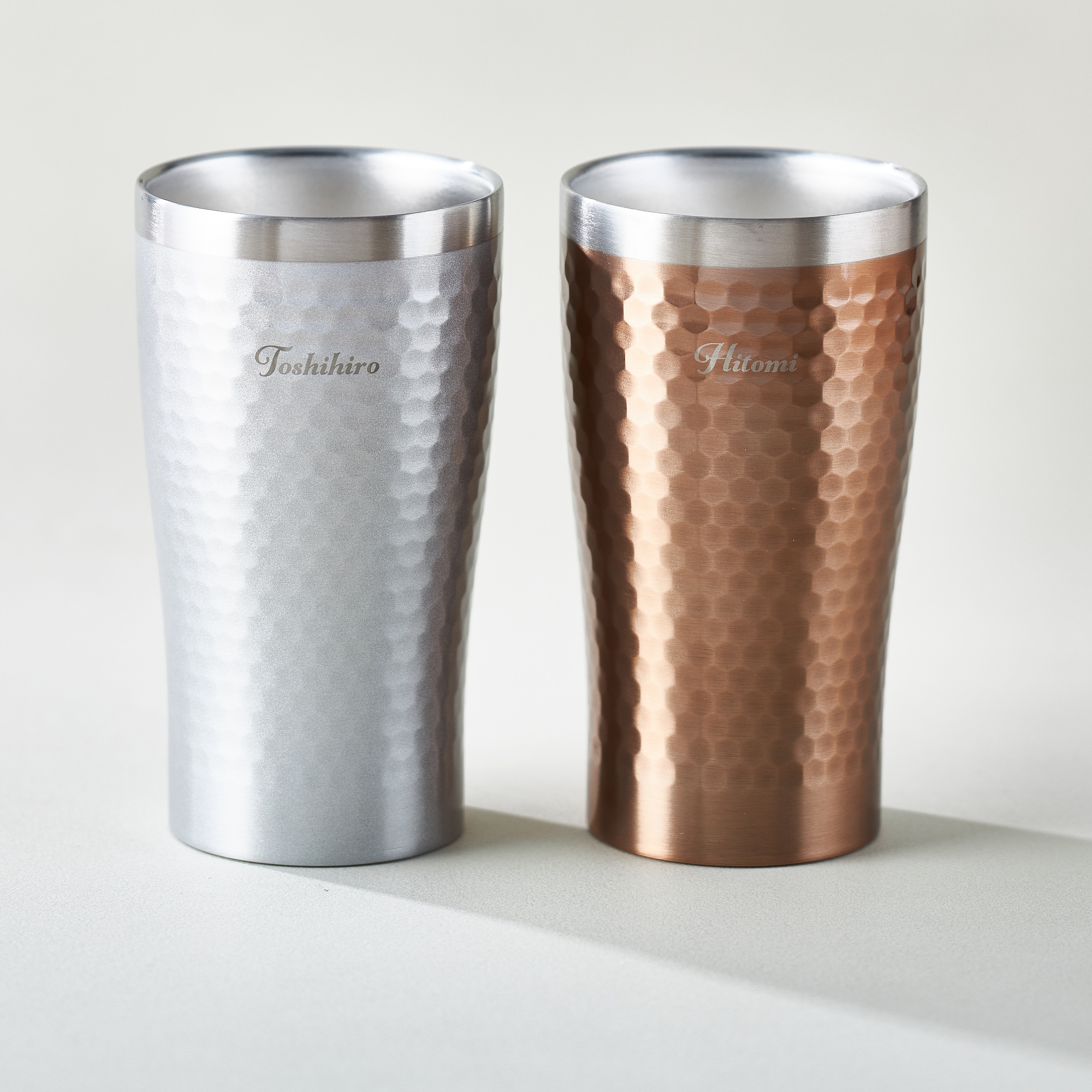 大口注文・法人のお問い合わせはこちらタンブラーにお相手のお名前を刻印できます。 ペアのタンブラー1つずつに刻印が可能なので、結婚祝いや記念日などの特別なプレゼントにおすすめです。 お名前の刻印をして、いつも以上に特別な贈り物をしてみてはいかがでしょうか。 ※ 名入れには、別途オプション料金がかかります ※ 画像はイメージです