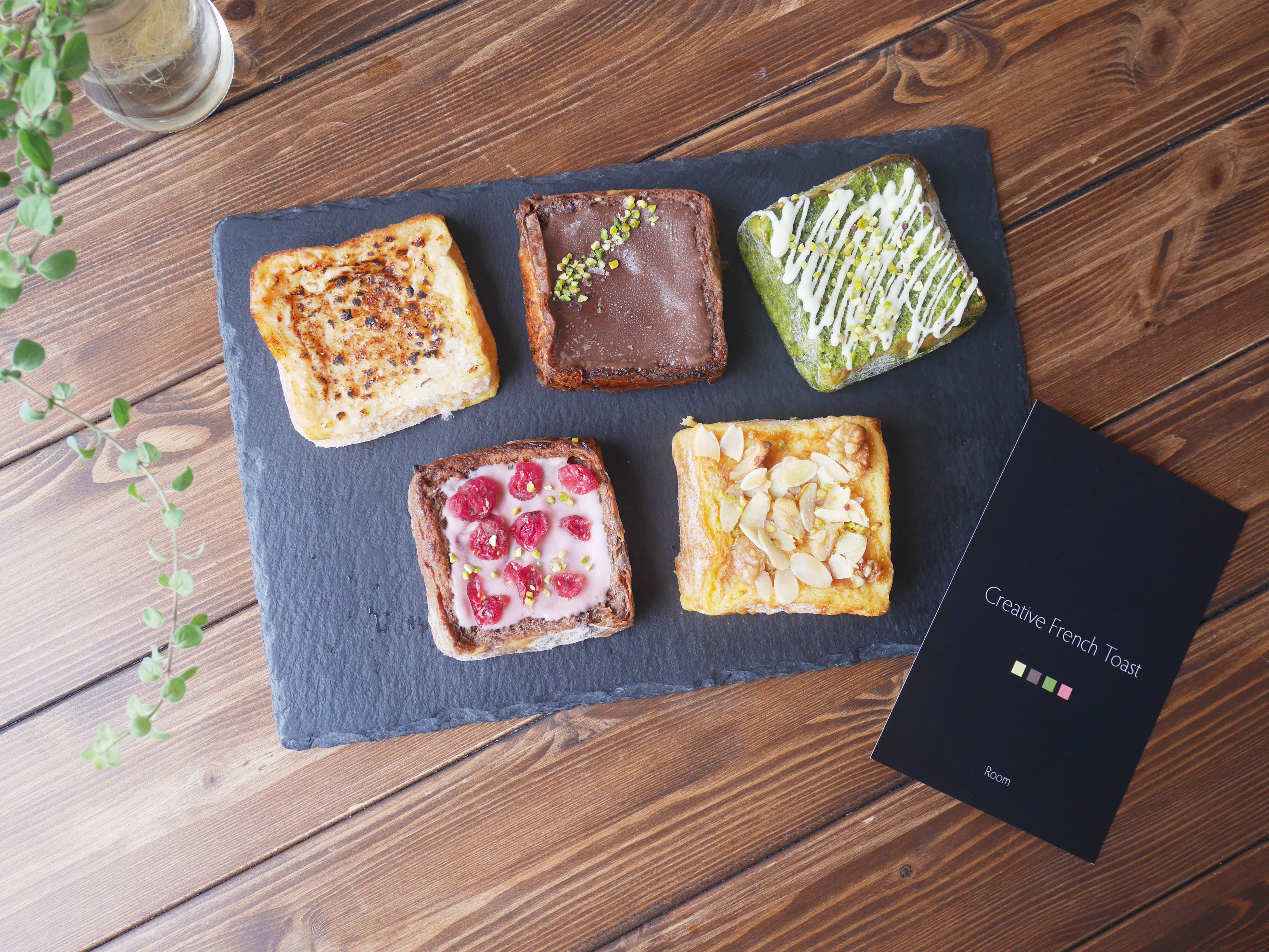 約7cm角のフレンチトースト ・姫路フレンチトースト(アーモンドバター) ・Wチョコ ・抹茶ホワイト ・チョコベリー ・キャラメルナッツ
