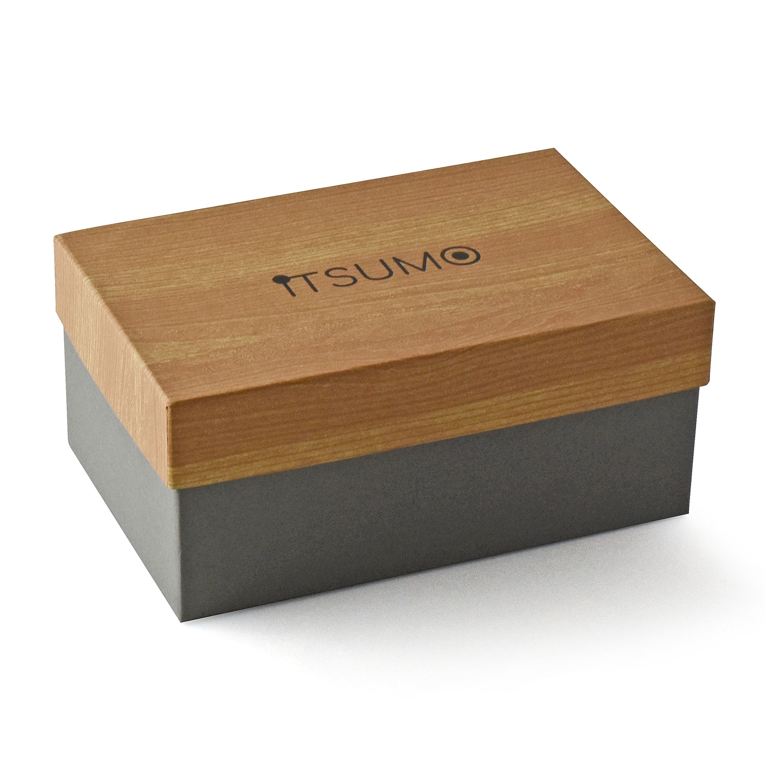ITSUMO いつも手元に置きたくなる”クセになる”器たち という意味を込めたロゴを箔押しした木目デザインの特別な化粧箱に入れお届けします。