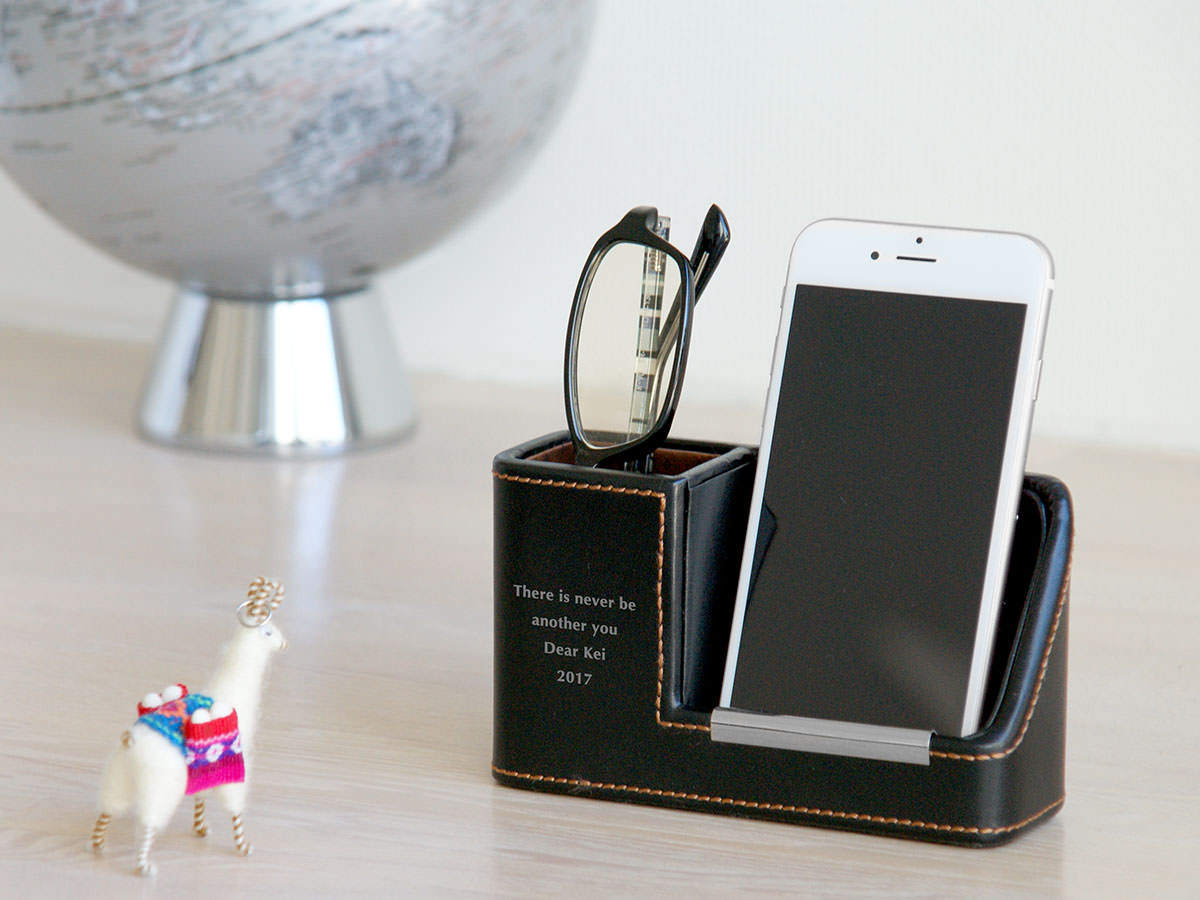 左側にメガネやペンを、右側には携帯電話やスマートフォンを収納できるスタンドです。スマホの隣には、デスクで使うパソコン用メガネや老眼鏡を置いたり、逆にデスクでは使わない花粉用メガネを置いたり。眼鏡を使わない方はペンスタンドにお使いいただけます◎