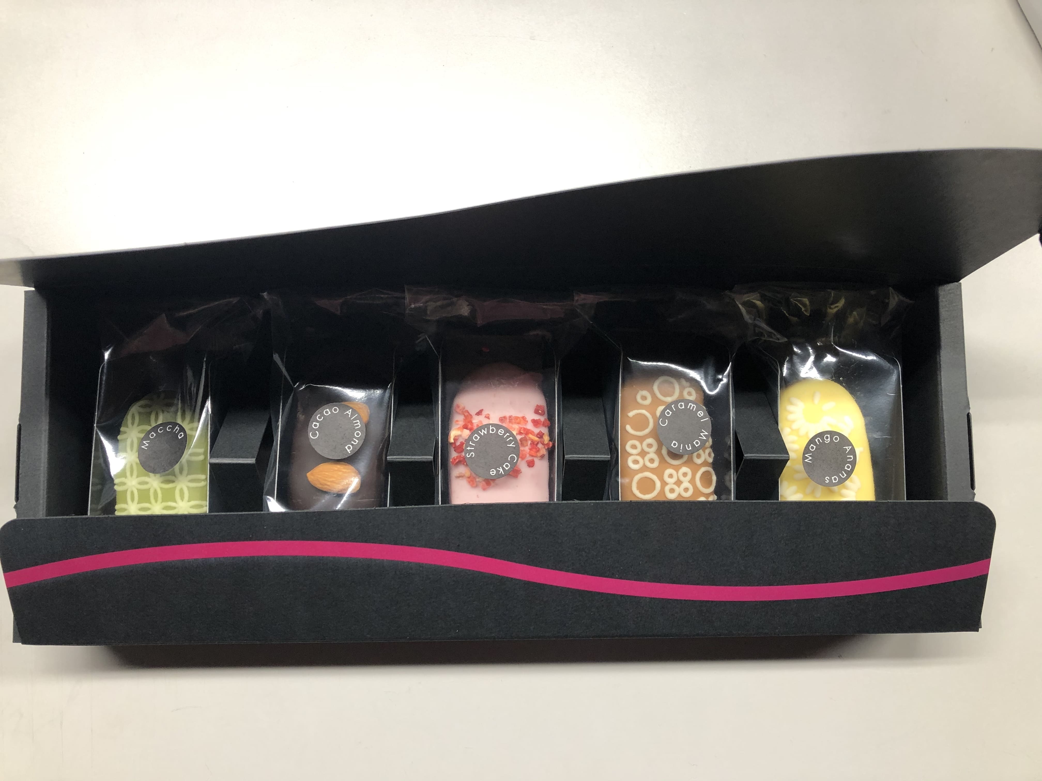 黒のマット系をベースにしたスタイリッシュな高級感漂うギフトケースに入っています。 蓋を開けると特殊な箱形状で商品一つ一つが際立って見えます。手提げ袋はお付けしておりません。