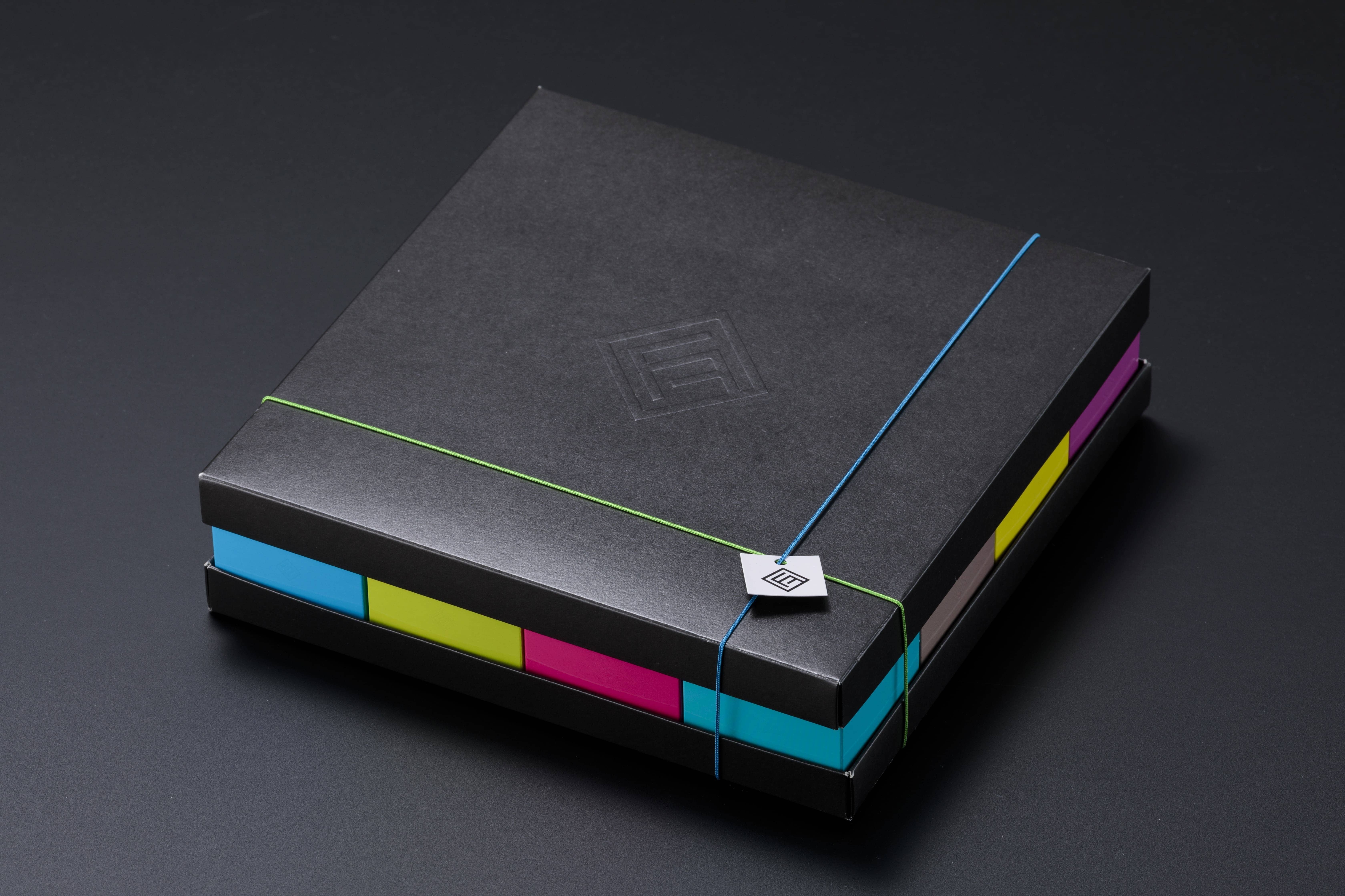 深いコクが後を引く見た目もスタイリッシュなフィナンシェです。カラフルな箱も魅力です。手提げ袋はお付けしておりません。