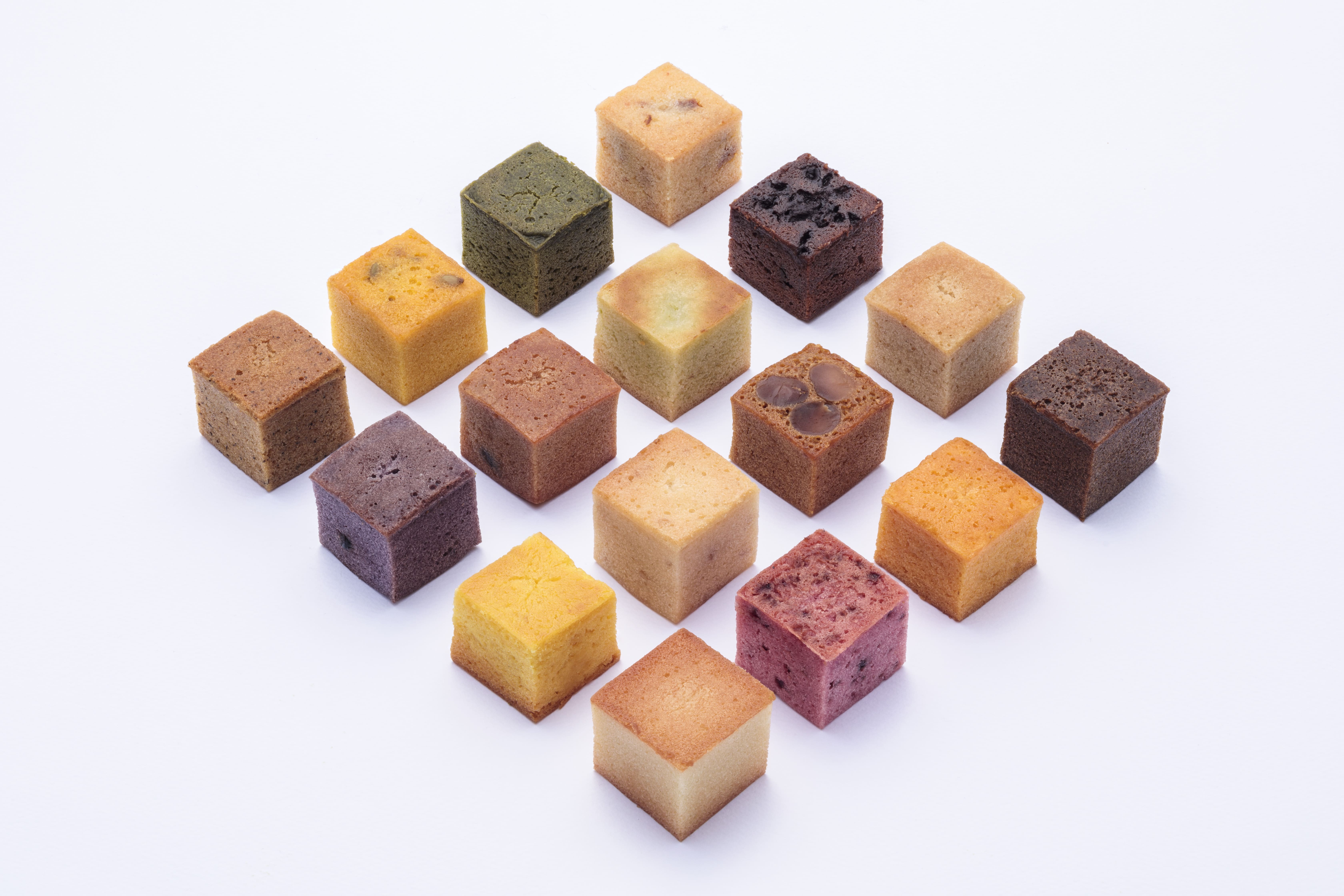 通常では表現しにくいキューブ状に仕上げている新感覚のフィナンシェです。 色や味、各種違った味わいを楽しめます。