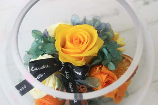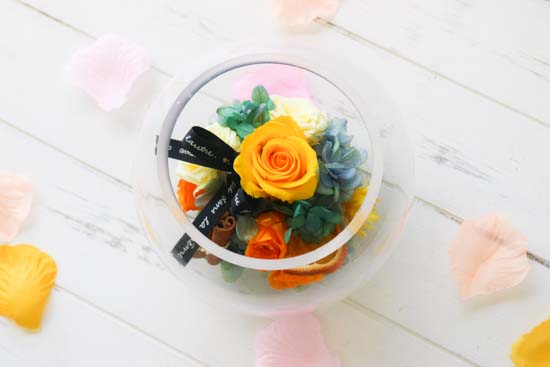 ギフトを最高の体験にを合言葉に様々な贈り物のサービスを展開するタンプが、独自に監修して作ったのがこのプリザーブドフラワーです。オレンジとイエローをメインカラーにしており、男性にもプレゼントできるフラワーカラーになっています。