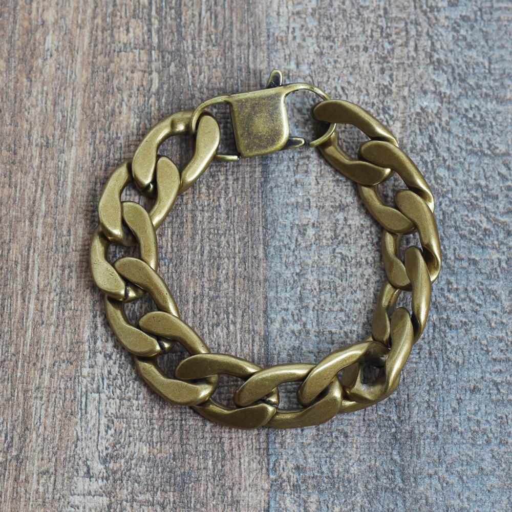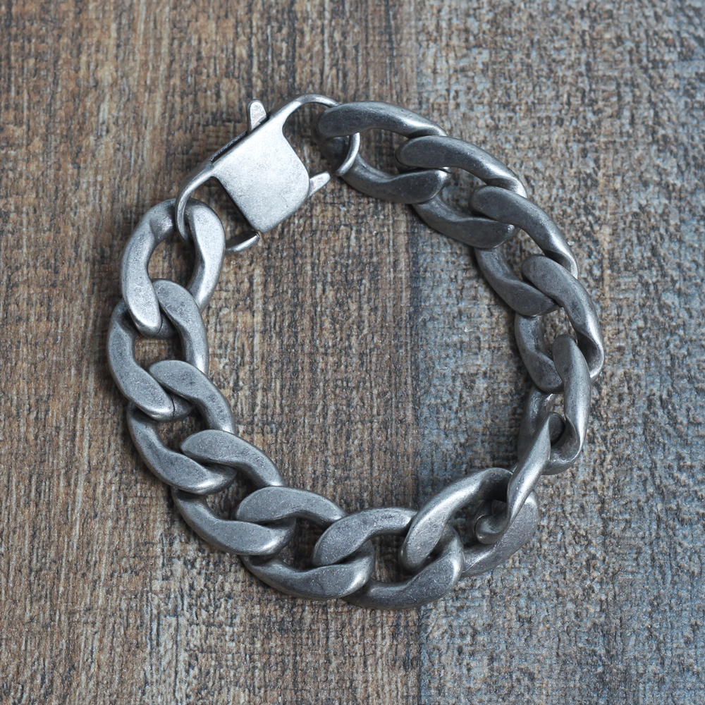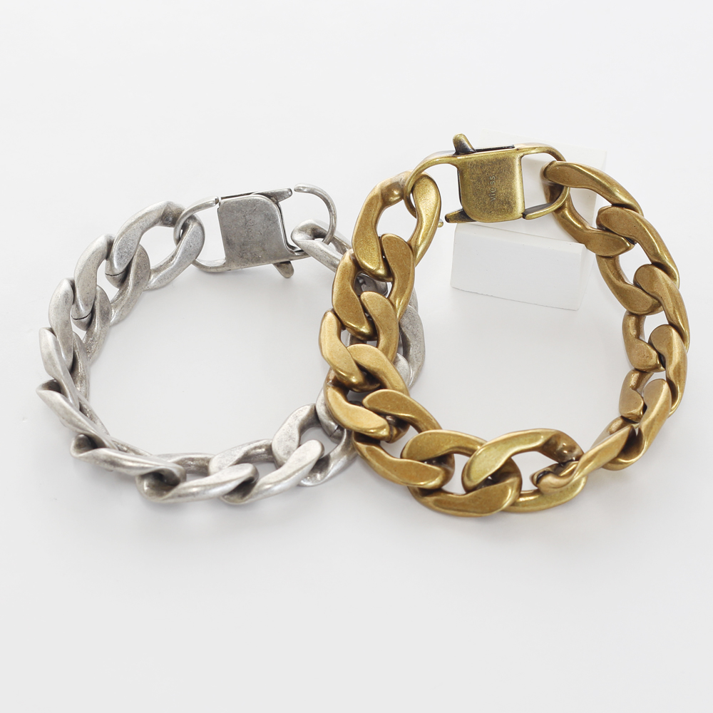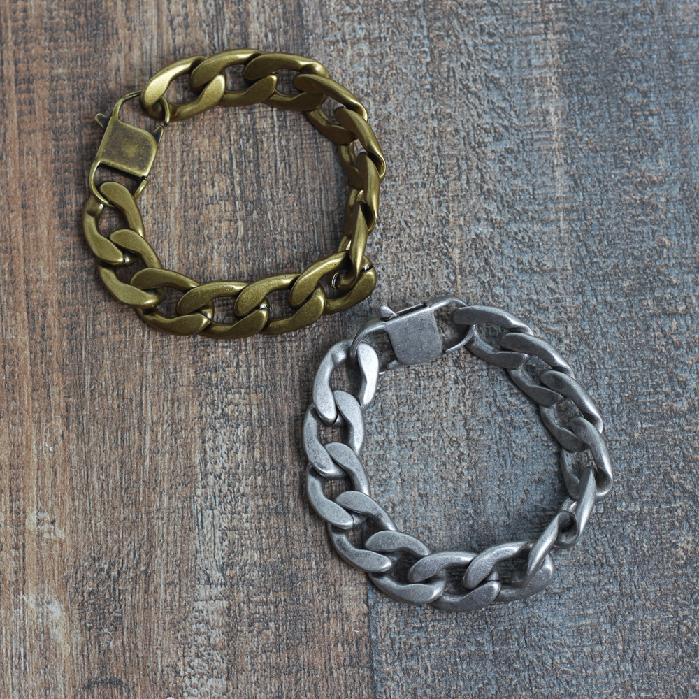 大口注文・法人のお問い合わせはこちら存在感抜群、他と圧倒的に差をつけるステンレスブレスレット。 燻し加工・古美仕上げはクールな印象になり、落ち着きのあるマット感と丸みが優しいチェーンデザインでユニセックスなブレスレットになっています。 どの位置でも留められるのでサイズ調整が簡単です。