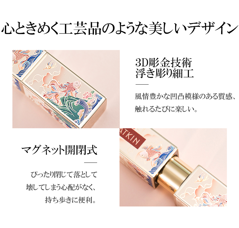 【CATKIN キャットキン】は2007年に広州市で誕生しました。 中国らしさを前面に押し出した、“国潮”と呼ばれるデザインが、中国国内でトレンドとなり【CATKIN キャットキン】はその先駆けとなりました。 中国国内に5,000を超える化粧品カウンターを持つCATKINの人気は中国のみならず、 世界中で勢いを増しており、 現在は世界18か国にまで展開を広げ、グローバルなブランドとして存在感を放っています。
