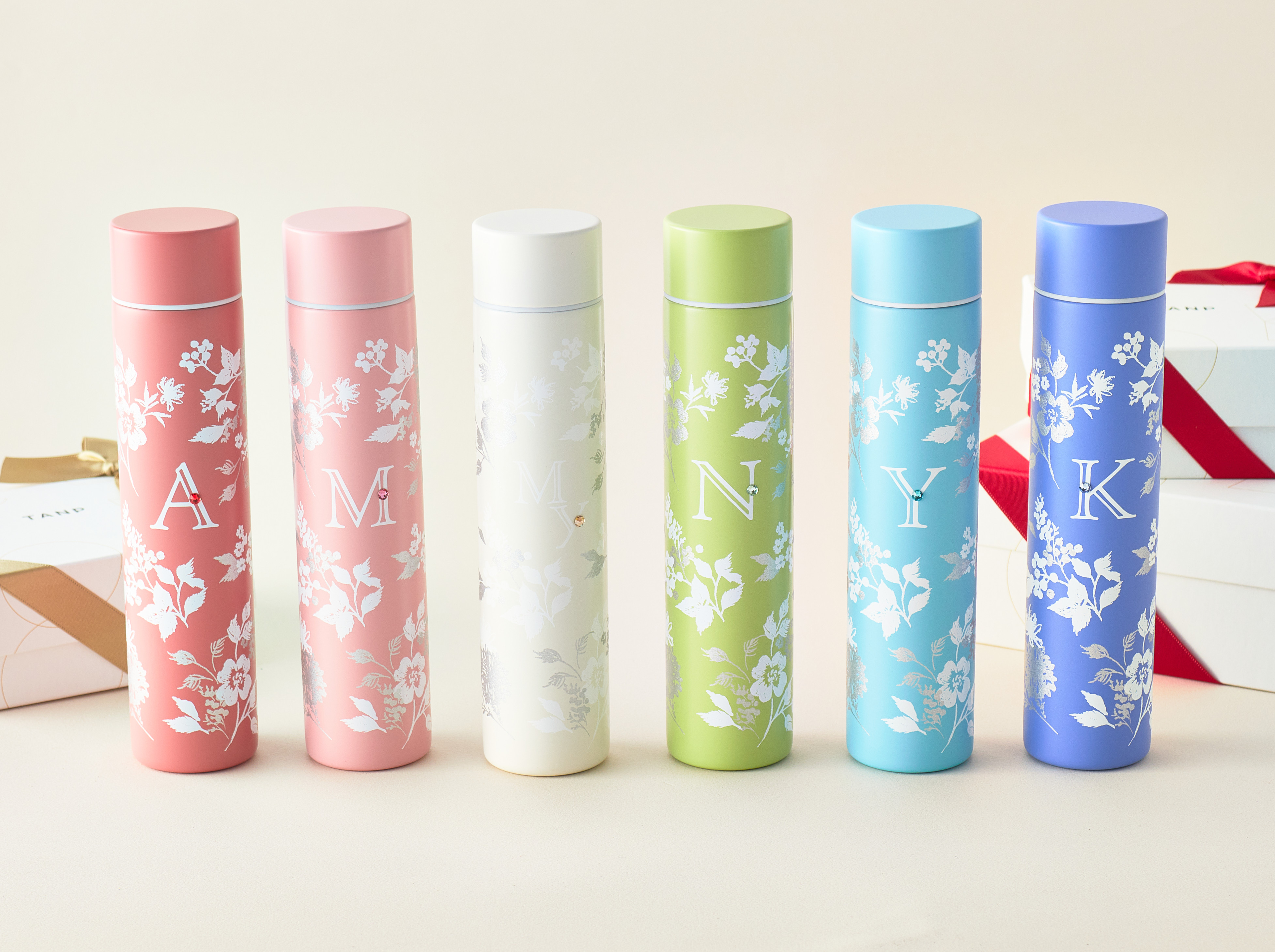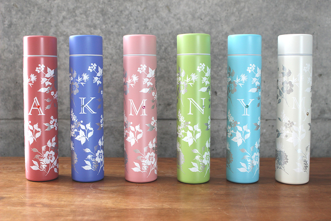 大口注文・法人のお問い合わせはこちらボタニカルデザインのイニシャルにクリスタルのワンポイントが入っています。 スタイリッシュでコンパクトなステンレスボトルです。
