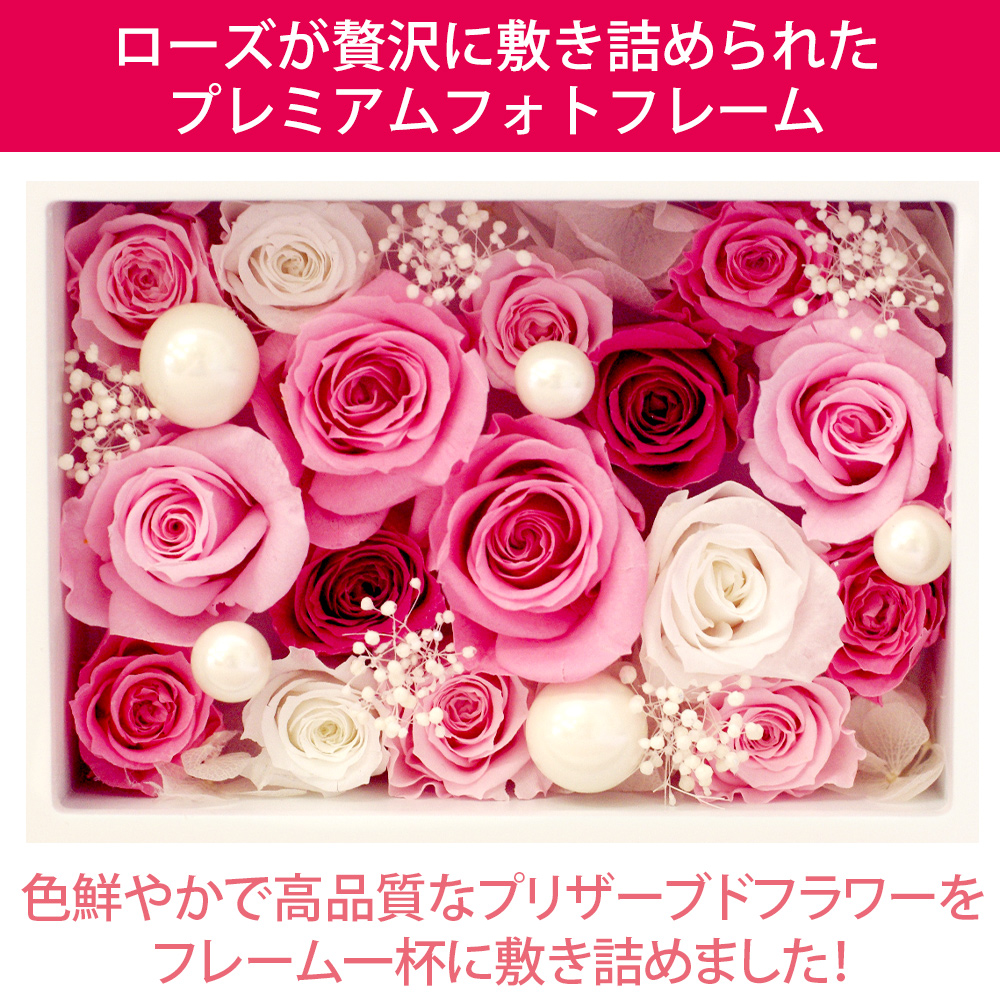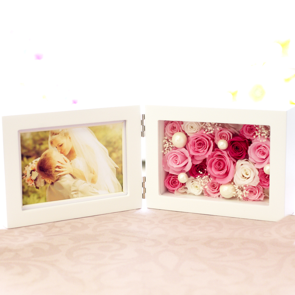思い出を飾るフォトフレームとプリザーブドフラワーはまさにベストマリアージュ!プリザーブドフラワーは水やりの必要がなく、半年~1年は綺麗な状態で楽しめます。お部屋に置いても可愛く、誕生日や新婚さんの結婚祝いとして最適。