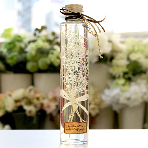容器の中に満たされている液体は、ハーバリウム専用の特殊なオイル。この中にドライフラワーやプリザーブドフラワーを漬け込むことで、その美しい色合いを約1年ほど保つことができます◎瓶を優しく振ると、中のお花もゆらゆら…。