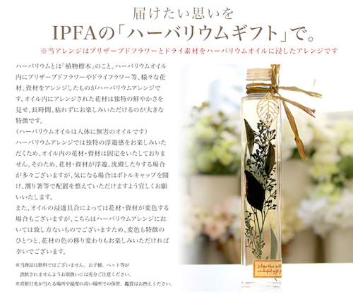 ハーバリウムは見た目にも華やかなうえ、花粉や花びらが散る心配もなく飾れるインテリアなので、ちょっとしたプレゼントにもおすすめ。さまざまなお祝いごとやご挨拶などに添えても喜ばれます。