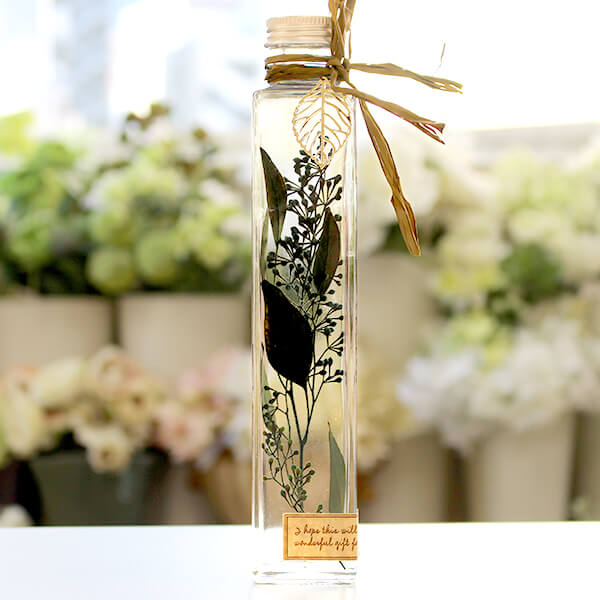 容器の中に満たされている液体は、ハーバリウム専用の特殊なオイル。この中にドライフラワーやプリザーブドフラワーを漬け込むことで、その美しい色合いを約1年ほど保つことができます◎瓶を優しく振ると、中のお花もゆらゆら…。
