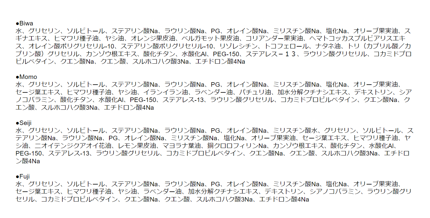 | 使用上の注意・使用方法 | 傷や湿疹、腫れ物など異常がある場合は使用しないでください。 お肌に合わない時や、使用中、赤み、はれ、かゆみ、刺激等の異常が出た場合、また日光があたって同じような異常が出た場合は、使用を中止し、皮膚科専門医等へご相談ください。使い続けますと症状が悪化することがございます。 目に入った時は、直ちに洗い流してください。 高温多湿または直射日光があたる場所には保管しないでください。 乳幼児やペットの手の届かないところに保管してください。 素材の特性上、お届け時に石鹸が汗をかき水滴が付着したり、石鹸が溶け、形が崩れていたり、袋に付着したりしていることがありますが、品質に問題ございません。 使用後は、水をきって保管してください。 衣服の洗浄に使用する場合は、石鹸の色材が色移りする場合があります。 天然色素につき、退色している場合がありますが、品質には問題ありません。 オイルなどの成分を含む製品は、航空危険物に含まれるため航空機に搭載することができません。そのため離島などの航空便を使用する地域にお住まいのかたへお届けの場合は、船便に変更するため1週間前後お届けが遅くなる可能性がございます。 |