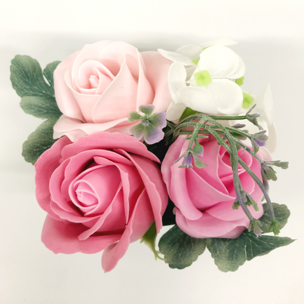 大口注文・法人のお問い合わせはこちら石鹸で作られた、観賞用のお花ソープフラワーブーケと、持っているだけで嬉しくなるようなローズリップ&チークの特別なギフトセット。