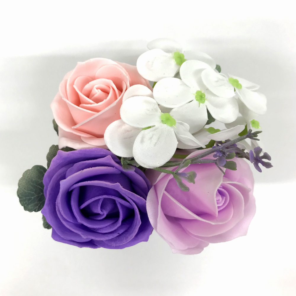 ソープフラワープチパープル・Rosy Lips S102 ピンクとエレガントなパープルの組み合わせで上品さプラスしたパープルのソープフラワープチ&堂々と咲き誇る魅惑的なピンクローズのRosy Lips。