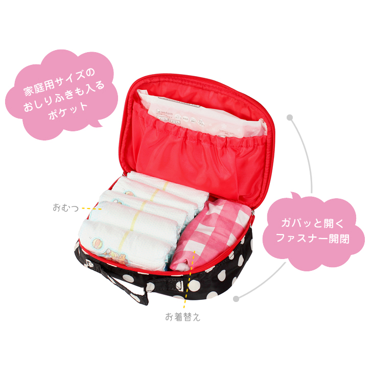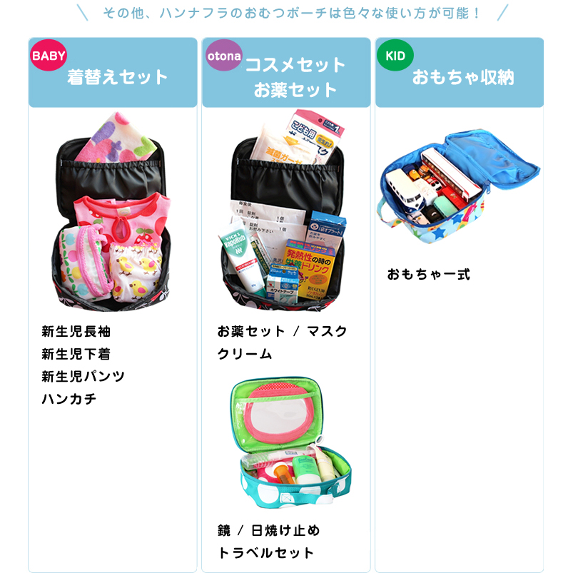 大口注文・法人のお問い合わせはこちらおでかけで必要な枚数のおむつが、すっきり収納できるおむつポーチです。 コンパクトなサイズながら、新生児から一番大きいパンツ型まですべてのステージに対応。ふっくらフタが膨らむデザインなので沢山収納することができます。 ベビーとのおでかけに必要なおむつはもちろん、おしりナップ、新生児用お着替え、おむつ替えシートまで、全部まとめて入ります。おしりふきやミニタオルも入る便利なポケット付きです。おむつ卒業後は、お着換え入れにしたり、化粧ポーチとしても長くお使い頂けます。撥水加工済みです。