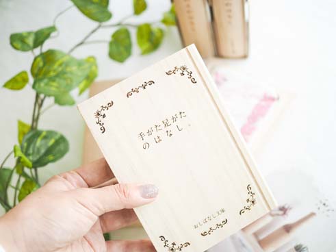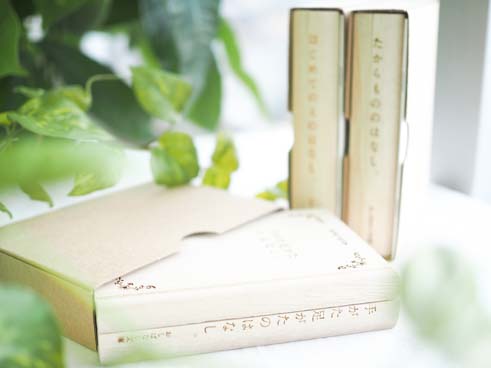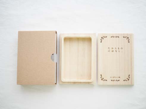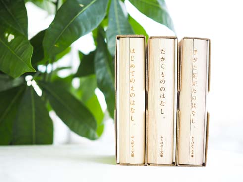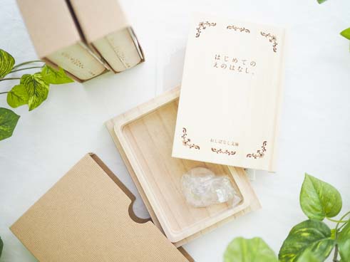 子どもの成長を大切に保存する「おしばなし文庫」は、いつか大きくなった我が子と話せるように、いろいろな思い出ばなしを、本にははさんで取っておく素敵なアルバム。そんなコンセプトの「おしばなし文庫」は、天然の桐材でできた木の本に、それぞれのお話に合わせて収納ケースが用意されていて、これぞ宝物の保存箱というつくりです。