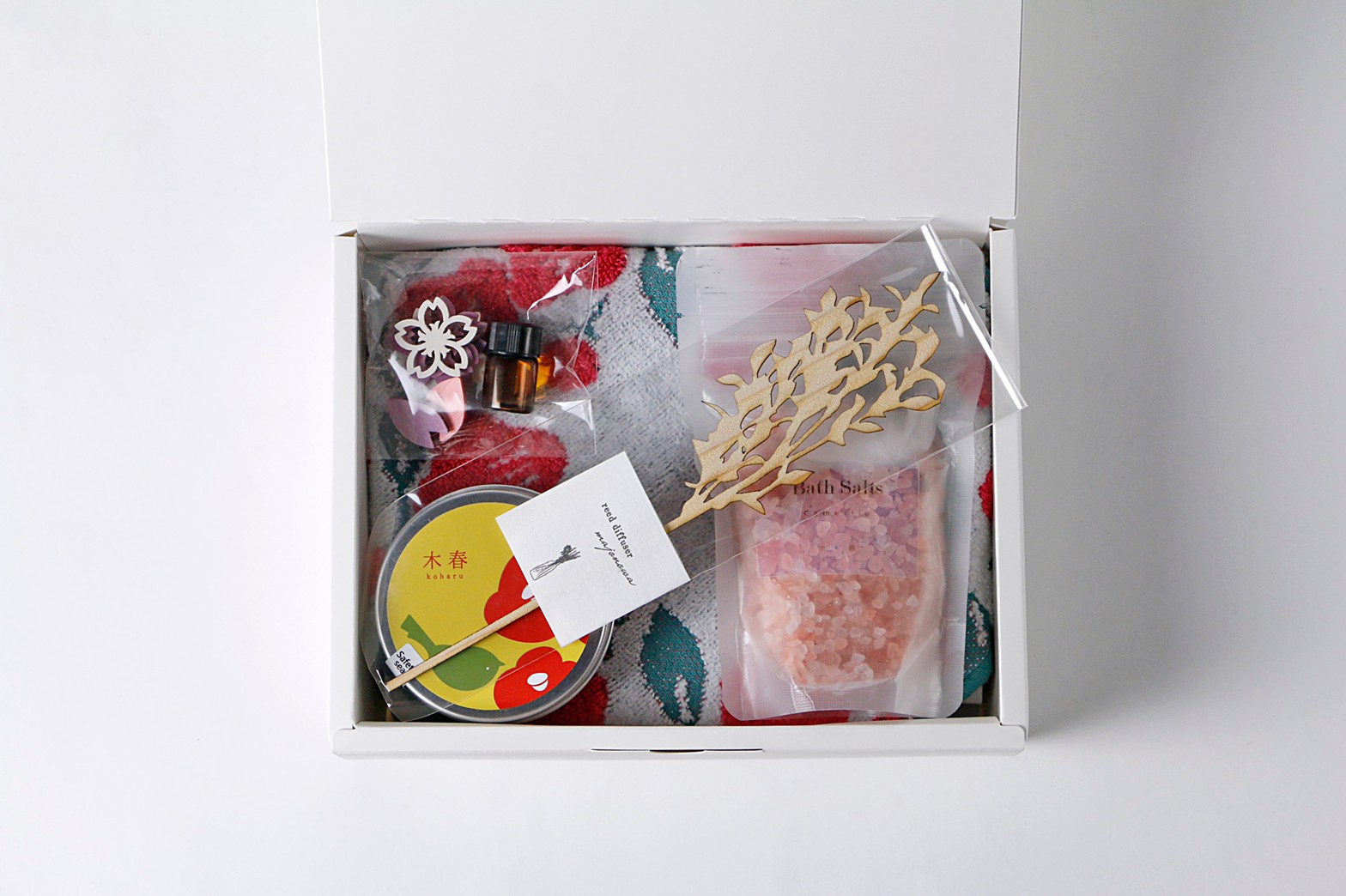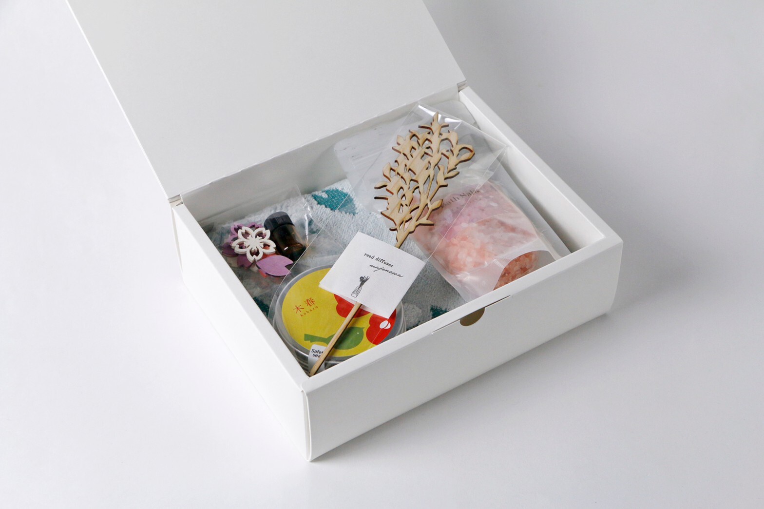 伊織ハンカチ、アロマキャンドル、バスソルト、アロマオイル、ウッドチップ、ウッドフラワーの豪華なギフトセットです。