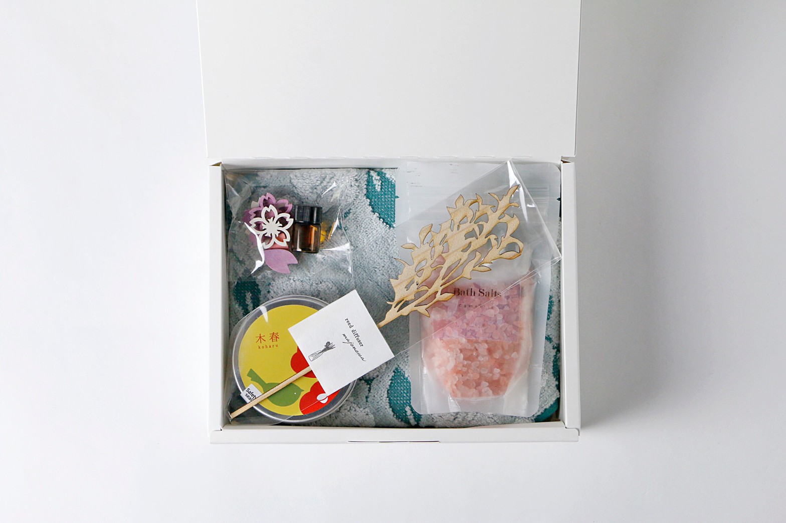 | 成分/原材料 | アロマオイル:天然精油 伊織ハンカチ:今治タオル バスソルト:天然岩塩 アロマキャンドル:ソイワックス/木製の芯/木春ブレンドアロマオイル |