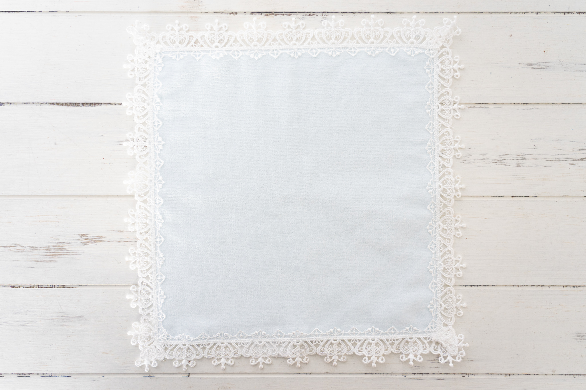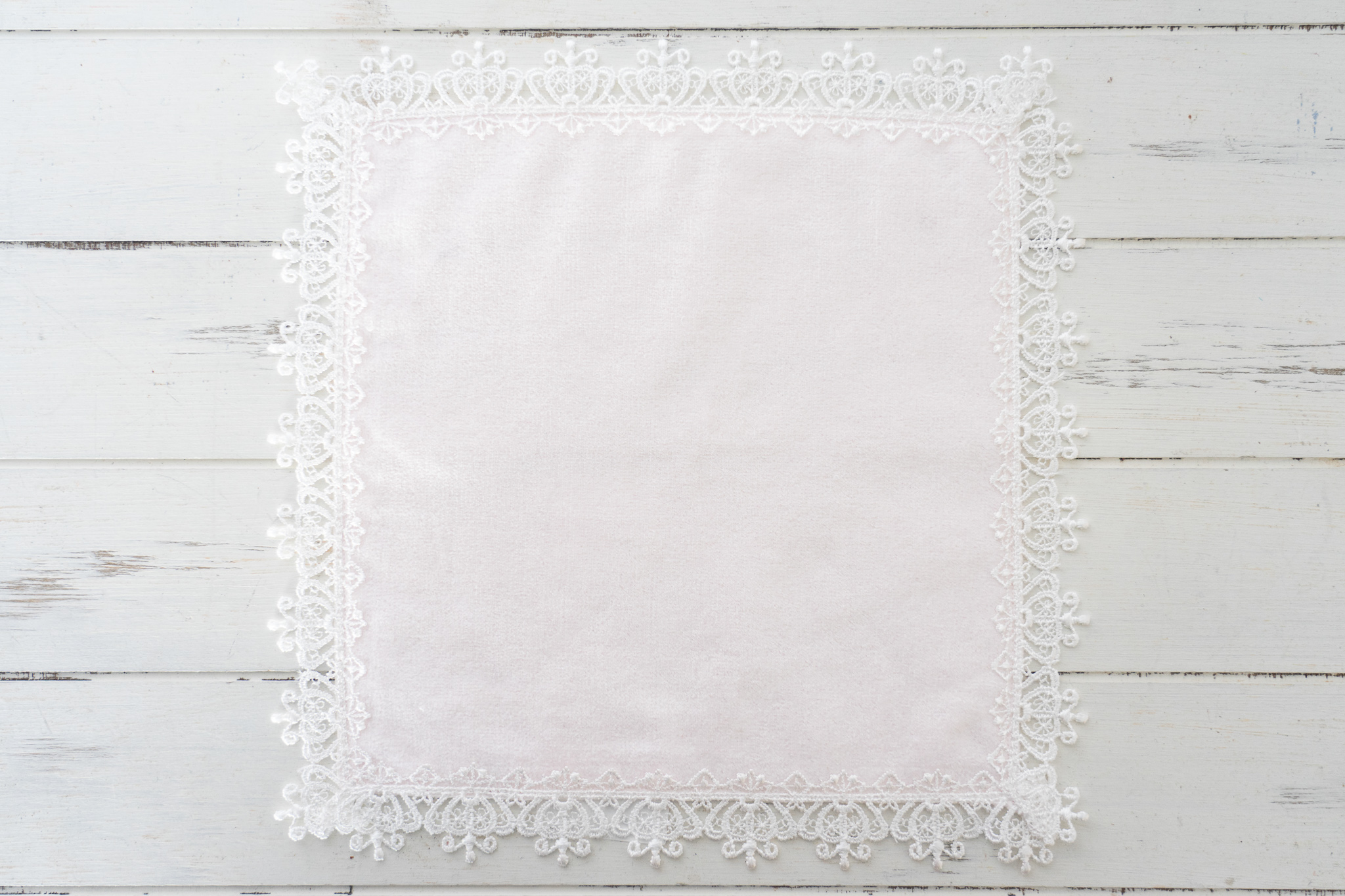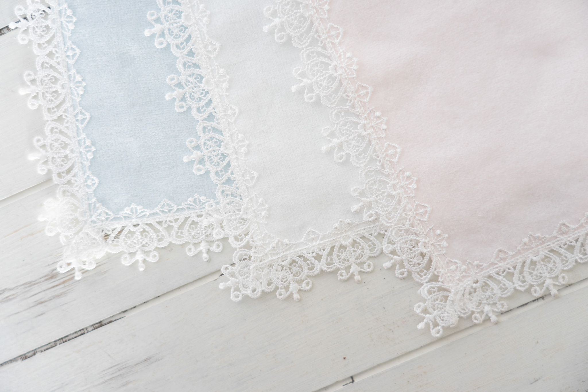 大口注文・法人のお問い合わせはこちら実用的で美しいハンカチをコンセプトに作られ、日本有数のタオル産地 今治産のタオル地を使用したタオルハンカチ。ふっくらとした肌触りが特徴的です。 表面にはパイルループをカットしたシャーリング加工を施し、ベルベットのような質感で高級感を演出しています。タオルの周りに贅沢にあしらったレースが最大の魅力です。