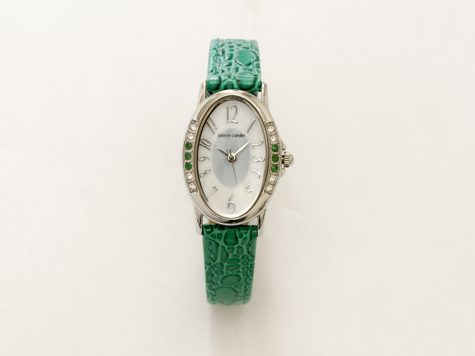 大口注文・法人のお問い合わせはこちら日本製ソーラームーブメントの搭載により煩わしい電池交換が不要です。 文字盤には白蝶貝を用い、なおかつセンターをグラデーションにすることでおしゃれに。ケースには天然石(レッド:ルビー、ブルー:サファイア、グリーン:エメラルド)を6石使用し、ラインストーンでより華やかに仕上げています。 バンドは本革製。重さもわずか20gです。