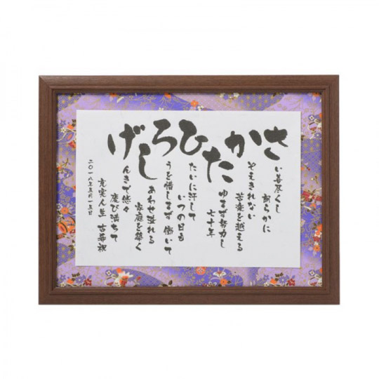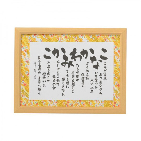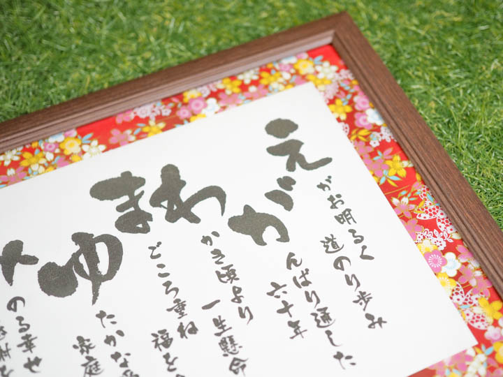 大口注文・法人のお問い合わせはこちら贈りたい相手のお名前から感謝の気持ちや幸せを願う気持ちを込めた詩を作ります。 教えていただいたお相手の人柄やお伝えしたい内容をもとに暖かく美しい日本語を厳選して七五調の詩に仕上げます。 大きな文字を右から読むとお名前になっており、高級筆文字フォントを使用しており、仕上がりが統一されとてもキレイに制作できます。