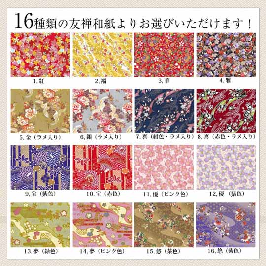 1.紅は和紙のサンプル一番人気 2.福は米寿祝におすすめ 3.華は還暦祝いにおすすめ 4.雅は古希祝い・喜寿祝いにおすすめ 5.金 6.銀は金婚式、銀婚式に 10.宝(赤色)は華やかなおばあちゃんに 11.優(ピンク色)はかわいいお母さんに 15.悠(茶色)は渋いおじいちゃんに 16.悠(紫色)はかっこいいお父さんに