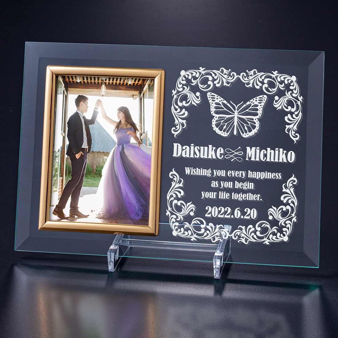 大口注文・法人のお問い合わせはこちら透明感の美しいガラス製フォトフレームはお部屋のインテリアにもピッタリマッチします♪ 結婚祝いやお礼、大切な記念日の贈り物に、、一生の思い出に残る記念品になります。