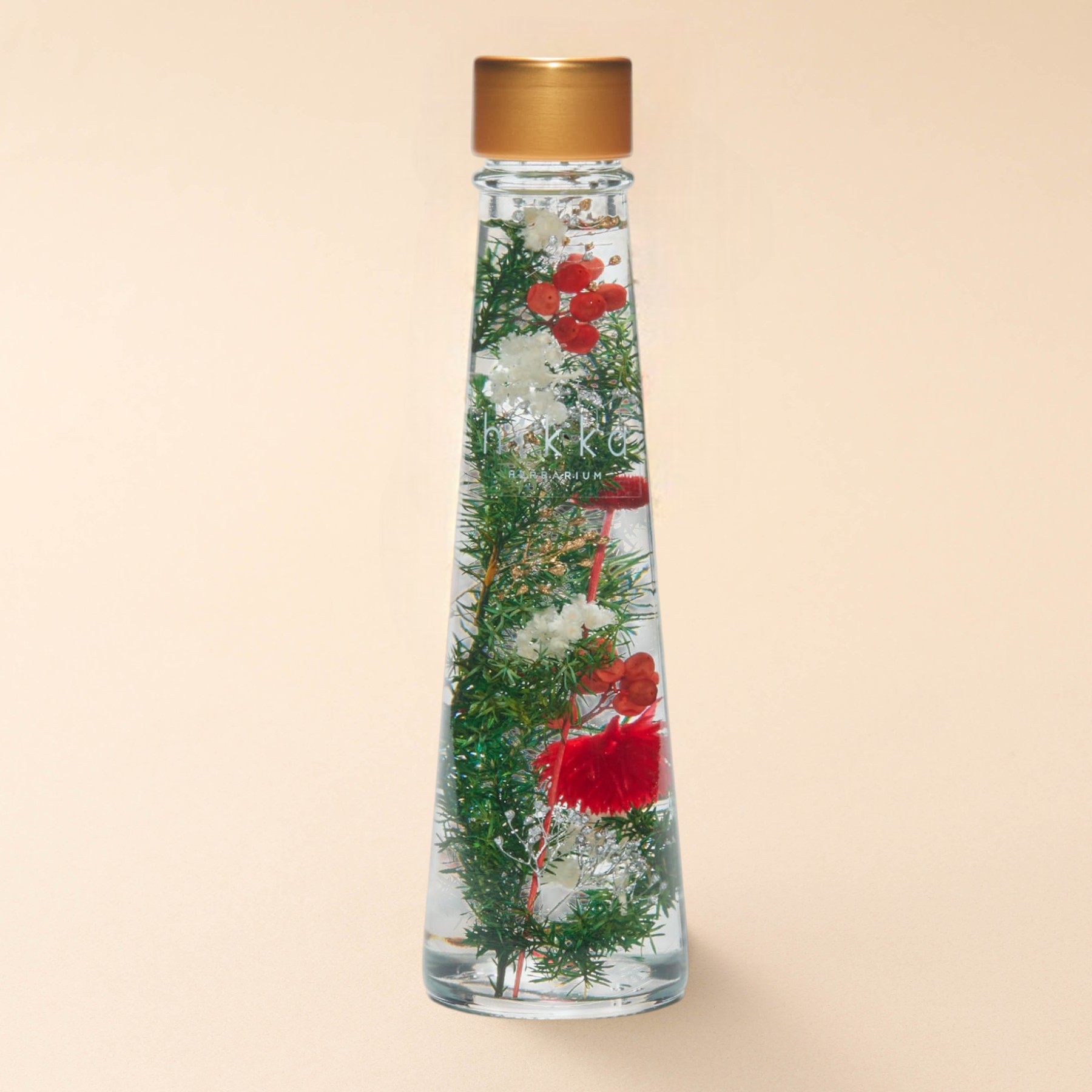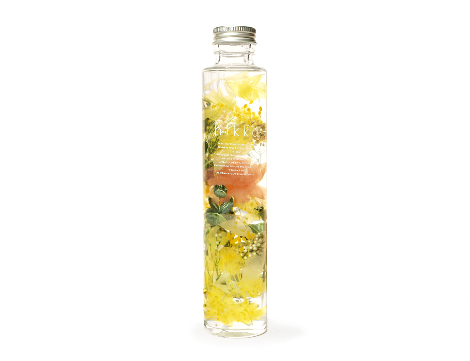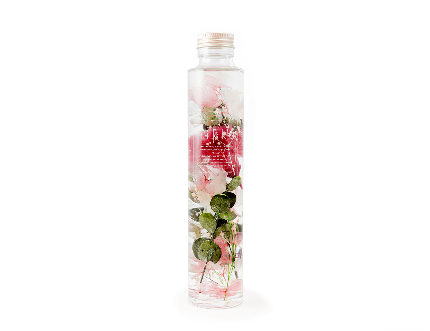 大口注文・法人のお問い合わせはこちらカーネーションがメインのスリム型ハーバリウムです。スタイリッシュなスリムボトルの中に、本物のお花をあしらったハーバリウム! 摘みたての花の美しい瞬間をクリアなオイルに浸し、輝きや浮遊感をお楽しみいただけます。もちろんお手入れは不要。 ボトルに詰められた花々は、長年の経験をもとに細部まで計算しつくされたhikkaならではのデザイン。全工程を手仕事で仕上げており、世界に同じものがひとつとない唯一無二のギフトです。