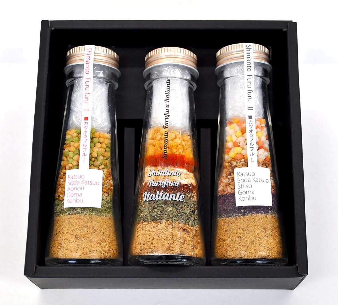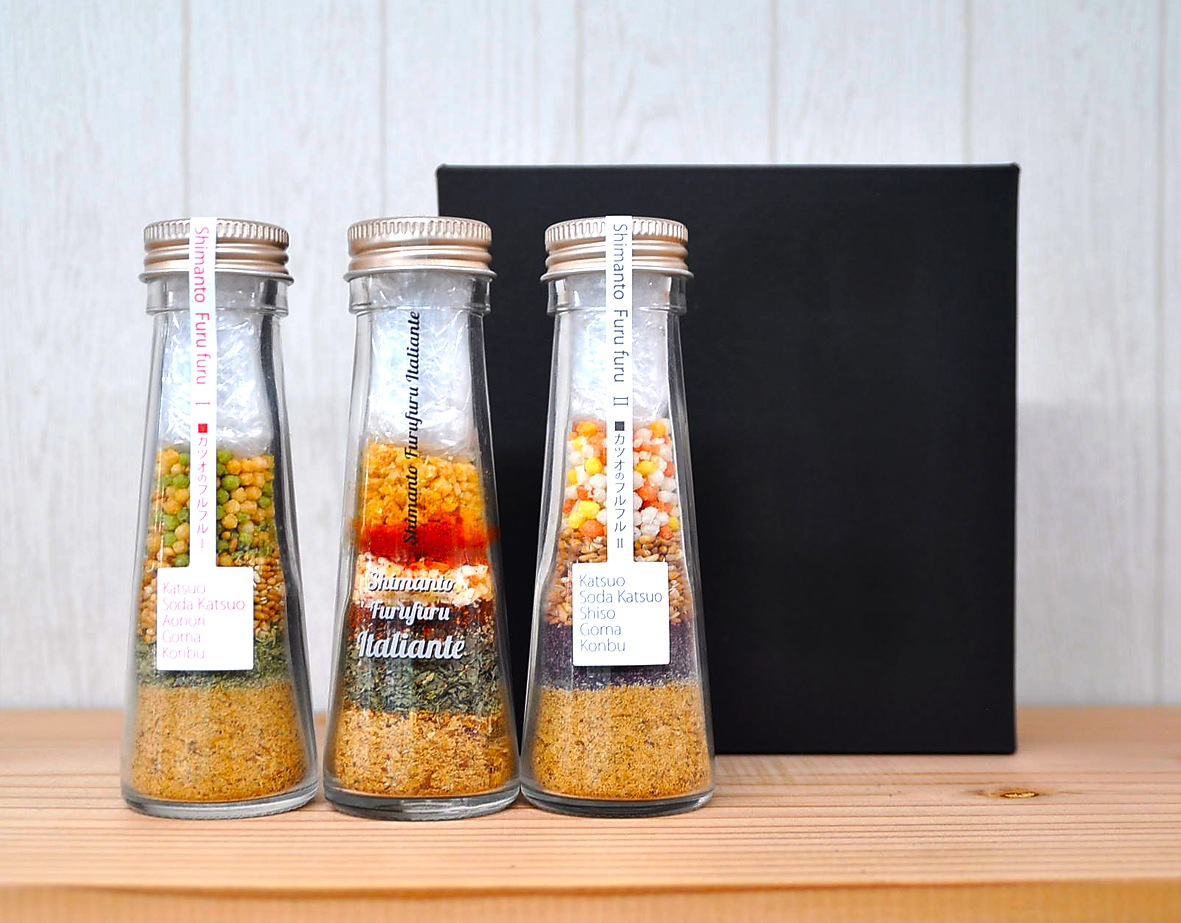 | 原材料 | かつお削りぶし(国内製造)、そうだかつお削りぶし(土佐清水産)、白ごま、赤しそふりかけ、昆布、あられ、食塩、青のり、ニンニク、玉ねぎ、チリペッパー、バジル、ブラックペッパー、パプリカ、クミン、オレガノ、植物油脂/着色料(アナトー) |