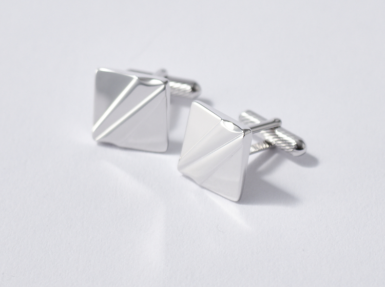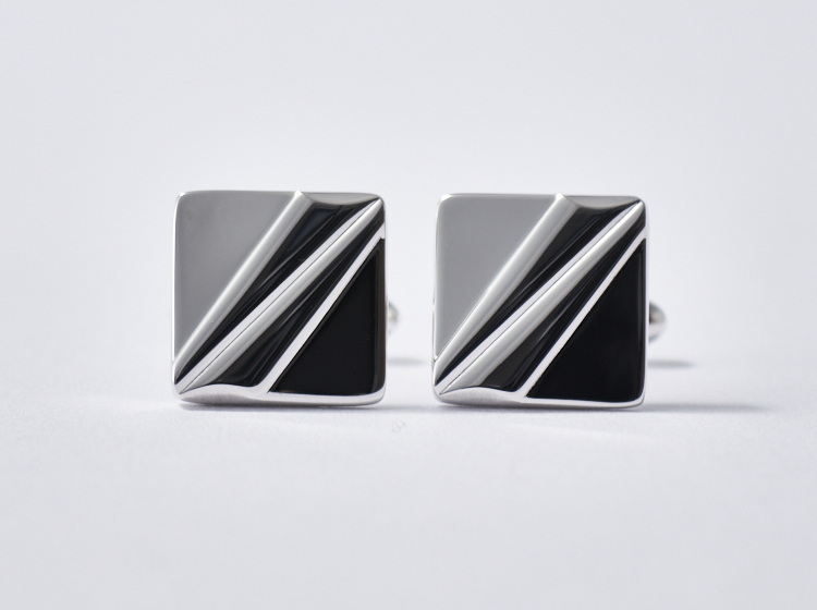 ベーシックなスクエア形のカフリンクス。 対角線に互い違いに入った2つのドーム形トライアングルが美しいアクセントとなっています。