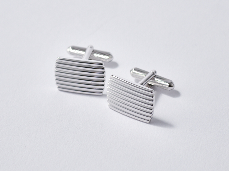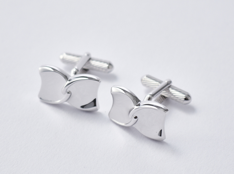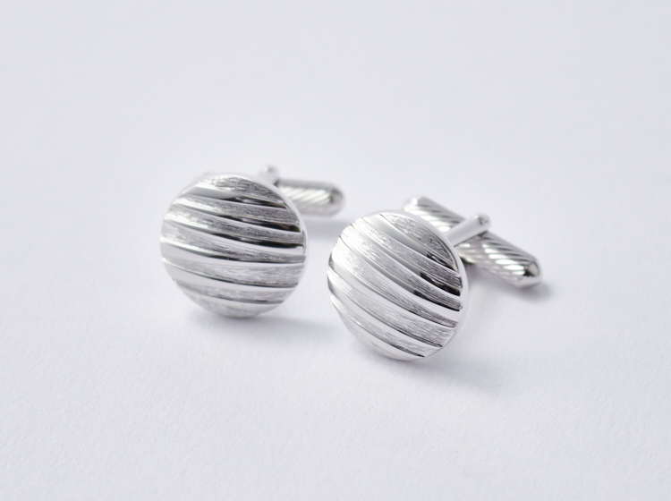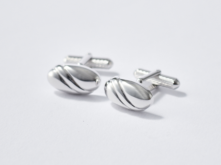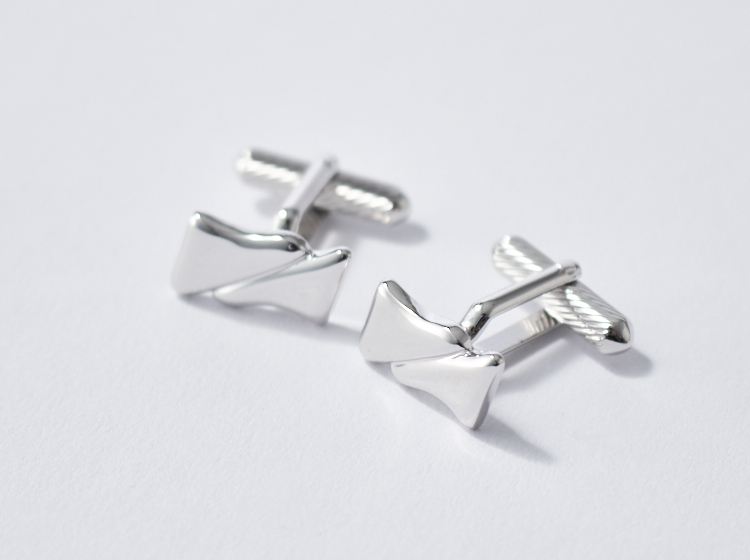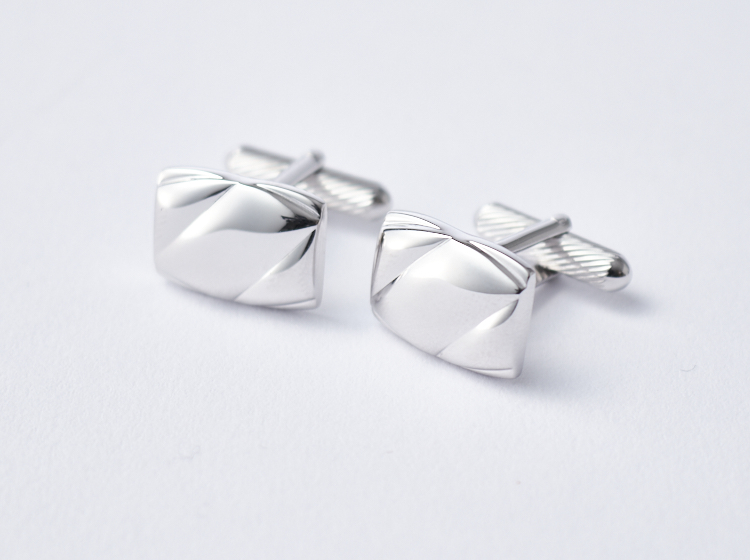 真鍮で成型されたカフリンクスを手作業中心の丁寧な仕事で作りこまれています。 仕上げには白系(銀色)貴金属の中でも極めて硬く、また最も高価とされるロジウムにてメッキが施されていますので、経年劣化しにくい手入れも楽な品物です。