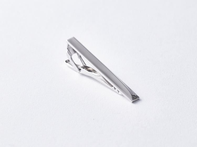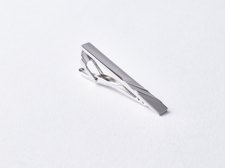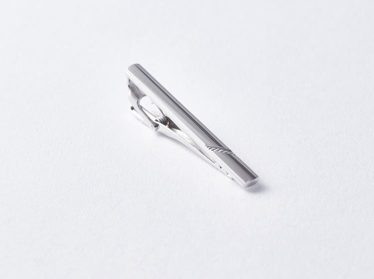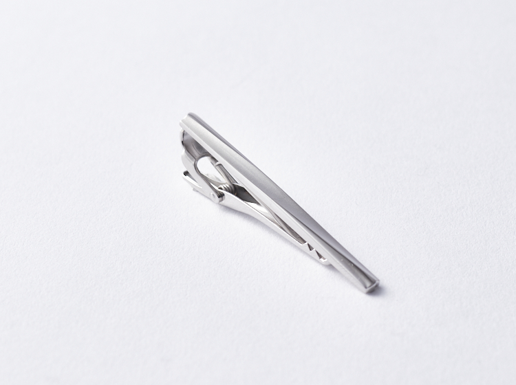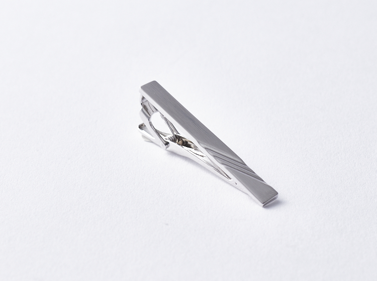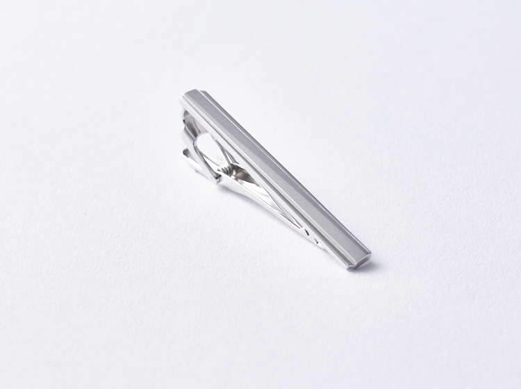 上下にテーパーをつけ、上部の平面部にダイヤモンド加工でスクエア柄を刻み込んだデザインです。 ネクタイのグリップをキープしたまま細身に見えるとてもシャープな印象の一品です。