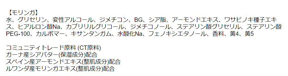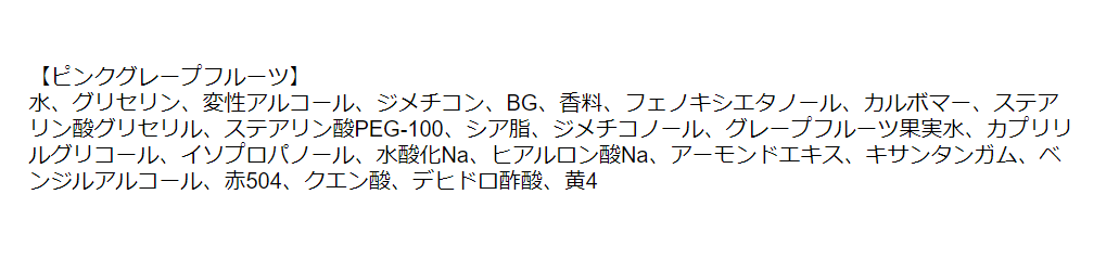 【マンゴー】 水、グリセリン、変性アルコール、ジメチコン、BG、香料、フェノキシエタノール、カルボマー、ステアリン酸グリセリル、ステアリン酸PEG-100、シア脂、ジメチコノール、カプリリルグリコール、マンゴー果汁、イソプロパノール、水酸化Na、ヒアルロン酸Na、ベンジルアルコール、黄5、アーモンドエキス、ソルビン酸K、デヒドロ酢酸Na、キサンタンガム、黄4、クエン酸、デヒドロ酢酸 コミュニティフェアトレード原料(CFT原料) ガーナ産シアバター(保湿成分) スペイン産アーモンドエキス(整肌成分)