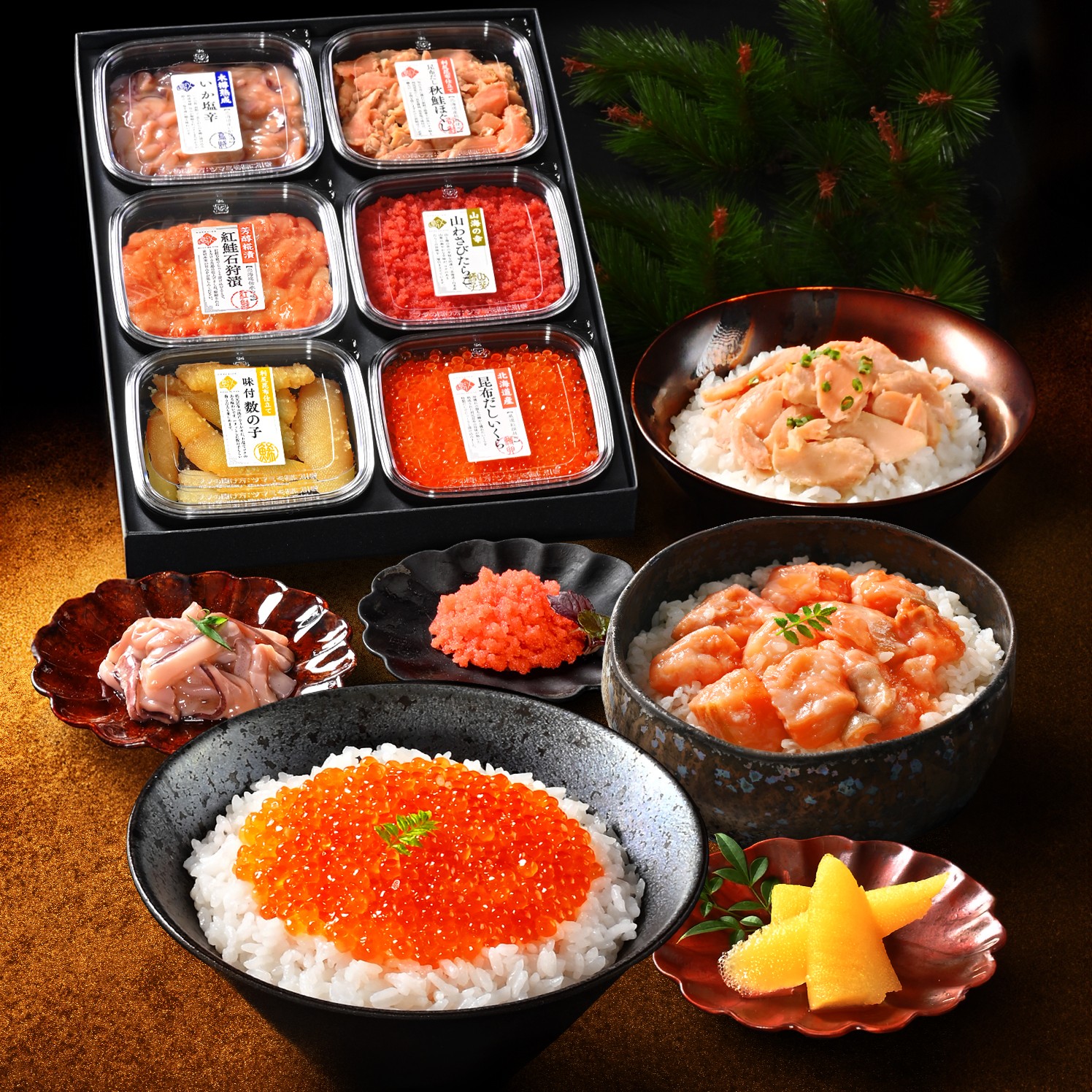 | 原材料(原産国含む) | ●昆布だし秋鮭ほぐし 秋鮭(北海道斜里産)、昆布塩(食塩、昆布粉末)、昆布醤油(大豆、小麦、昆布、糖蜜、アルコール)、礼文だし(昆布エキス、かつお節エキス、根昆布)/調味料(アミノ酸等)、酸味料、増粘多糖類、甘味料(ステビア)、カラメル色素、(一部に小麦・さけ・大豆を含む) ●昆布だし 秋鮭いくら醬油漬 秋鮭卵(北海道斜里産)、醤油、みりん、昆布エキス、かつお節エキス/調味料(アミノ酸等)、(一部に小麦・いくら・大豆を含む) ●味付け数の子 ニシンの卵巣(北海道産)、米発酵調味料、醤油、食塩、砂糖、かつお節エキス、和風だし(かつお節、昆布エキス、還元水あめ)、たん白加水分解物/調味料(アミノ酸等)、ソルビトール、酒精、酸味料、ビタミンB1、(一部に小麦、大豆含む) ●木樽熟成 いか塩辛 するめいか(国産)、食塩、はちみつ/ソルビトール、調味料、(アミノ酸等)、甘味料(甘草、ステビア)、増粘剤(キサンタンガム)、酸味料、(一部にいかを含む) ●山わさびたらこ すけとうだらの卵巣(北海道産)、食塩、蝦夷山わさび、砂糖、利尻昆布エキス、清酒/調味料(アミノ酸等)、香料、ソルビトール、酸化防止剤(V.C)、トレハロース、ph調整剤、ナイアシン、甘味料(甘草、ステビア)、酵素、発色剤(亜硝酸Na)、着色料、(赤102、黄5)、(一部に大豆を含む) ●紅鮭石狩漬 紅鮭(ロシア産)、糀、発酵調味料、こうじ調味液、食塩/甘味料(ソルビトール)、調味料(アミノ酸等)、pH調整剤、増粘剤(キサンタンガム)、(一部にえび・小麦・さけ・大豆を含む) |