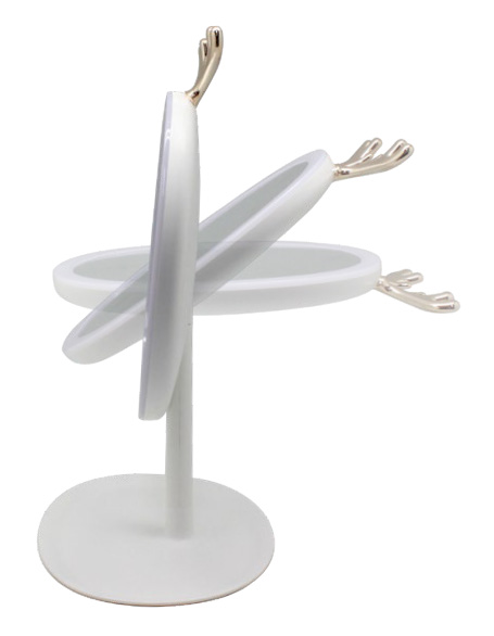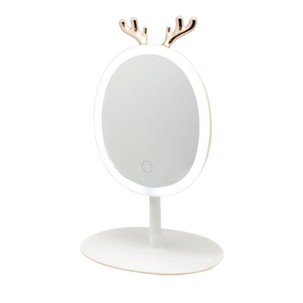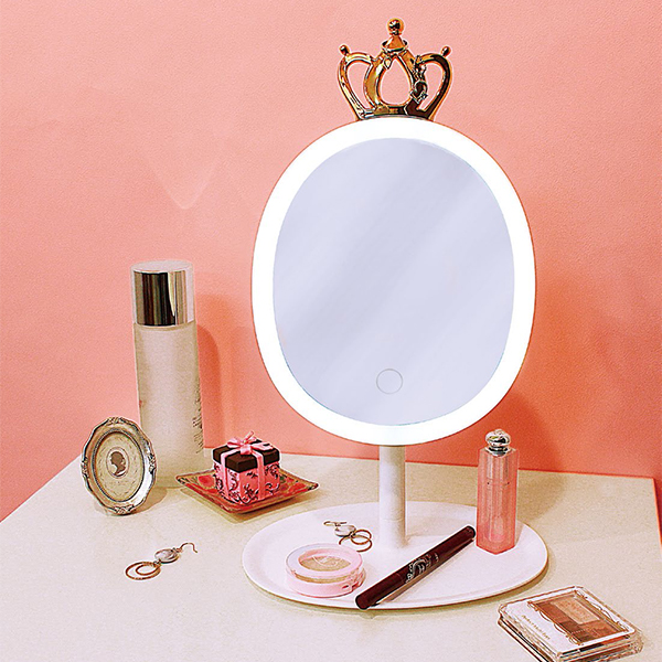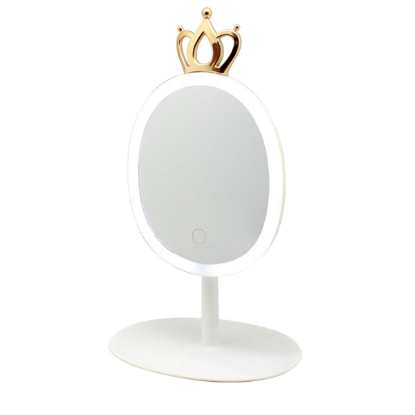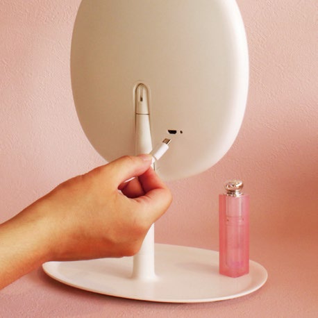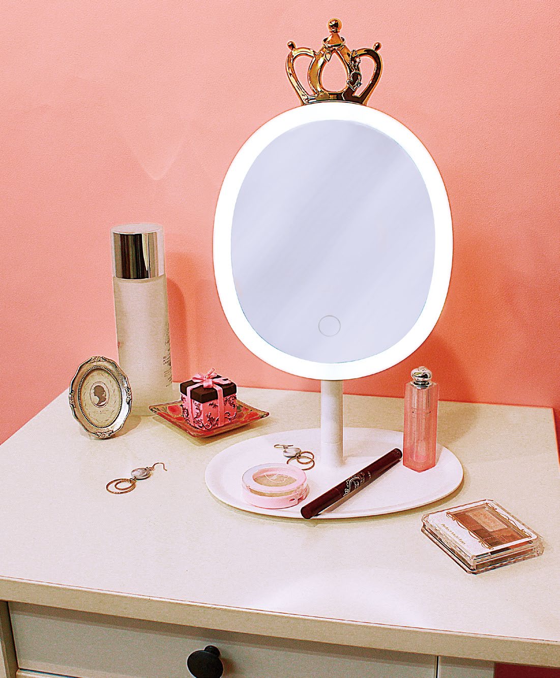 大口注文・法人のお問い合わせはこちら「これで気分はプリンセス!」 飾っておくだけでも可愛い、メイクアップミラーです。 USB給電対応で、自然光に近いLEDライト(色温度6000~6500K)を使用し微妙な色味まできちんと見えるのでメイクの仕上がりが良くなります。 光の加減を調節できる無段階調光機能付きです。 スタンド部分はトレーになっていて、メイク道具やアクセサリーを置くことができます。 また王冠(角)部分には指輪やネックレスなどをかけることができます。 リチウムイオン電池専用のUSB充電式(充電専用ケーブル付属)。コードレスなので使いたい場所に置けます。 ミラー面を天井に向けると、間接照明としても使用できます。 ※組立式になります。