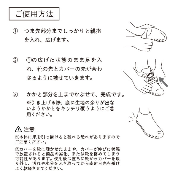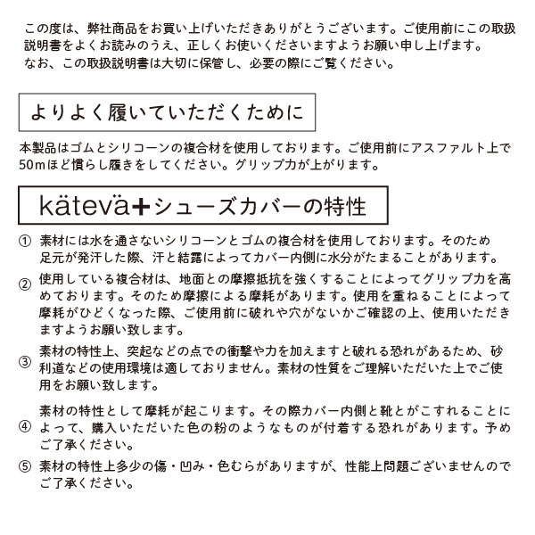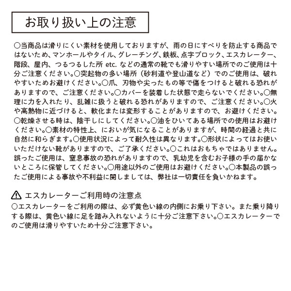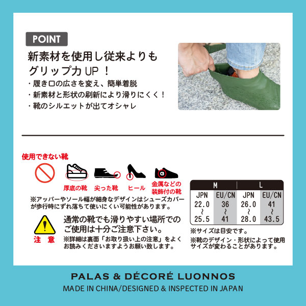 大口注文・法人のお問い合わせはこちらタイルなどの上でも滑りにくく履きやすい特殊素材を使用した新商品! 履いてる靴に被せて使用する防水シューズカバーです。 雨や雪の日はもちろん、キャンプや野外イベントでの泥汚れ防止にもおすすめ。 新素材とフォルムの刷新により、滑りにくさと履きやすさを両立しております。 前回から更にグリップを強くするために、試着・使用テストを重ねアウトソールのデザインも改良しました。 伸縮性があり、靴や足首にピッタリフィットするので、雨具にありがちな野暮ったさがなくスマートにつかえます。 BK色ならビジネススーツの際にも使えそうですね! スリムなデザインなので、付属のパッケージを収納ポーチとしてつかえば、コンパクトに持ち運びが可能です。 また雨の中自転車に乗ると、傘をさしても靴が濡れてしまいがちですが、こちらのカバーがあればしっかりカバーできます。 パッケージデザインもおしゃれなので、自分用はもちろんギフトにもおススメです。 ※通常の靴でも滑りやすい場所でのご使用は十分お気をつけください 本品のご使用にあたっては、商品に同封いたしております取扱い説明書をよく読み、誤った使用をしないでください。