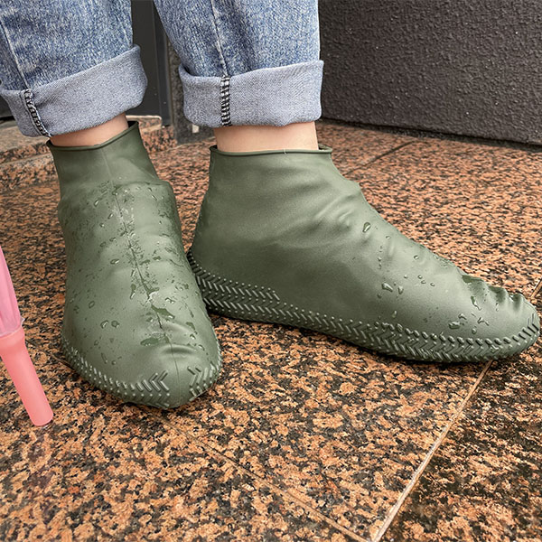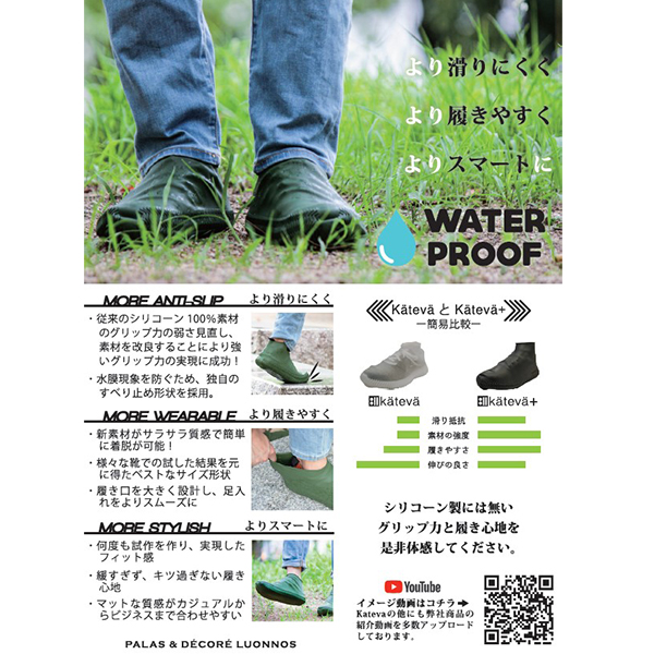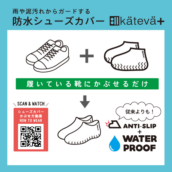 タイルなどの上でも滑りにくく履きやすい特殊素材を使用した新商品が登場!履いてる靴に被せて使用する防水シューズカバーになります。雨や雪の日はもちろん、キャンプや野外イベントでの泥汚れ防止にもおすすめ!雨具にありがちな野暮ったさがなくスマートにつかえます。