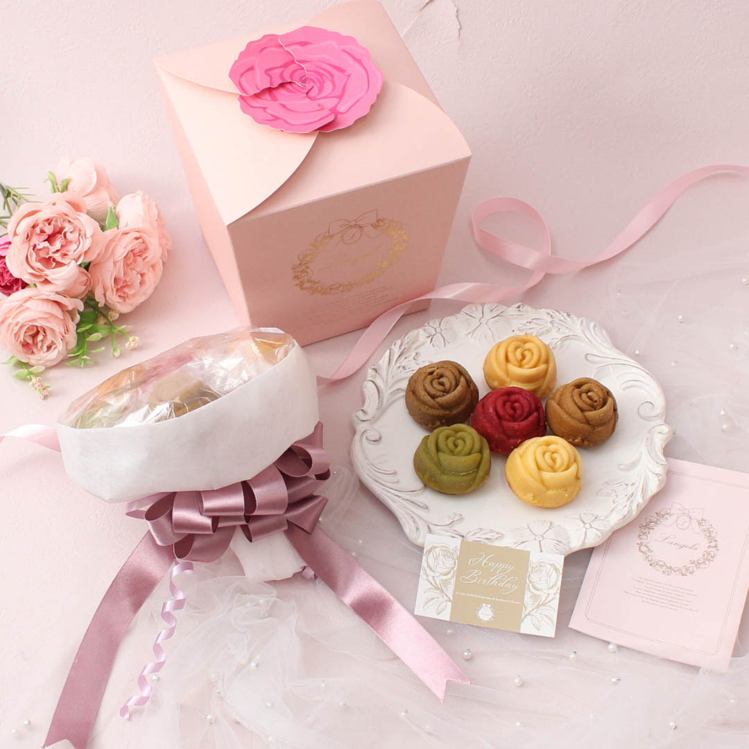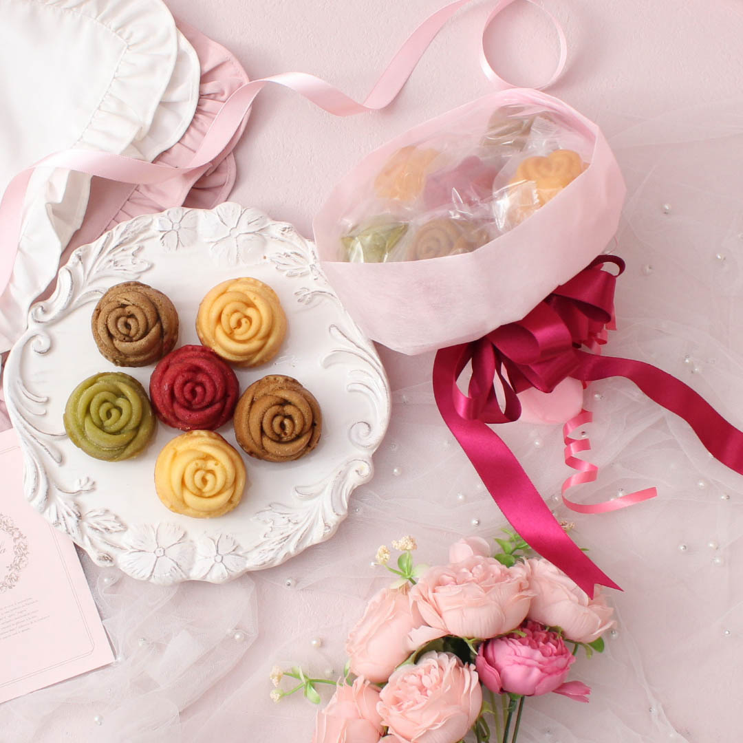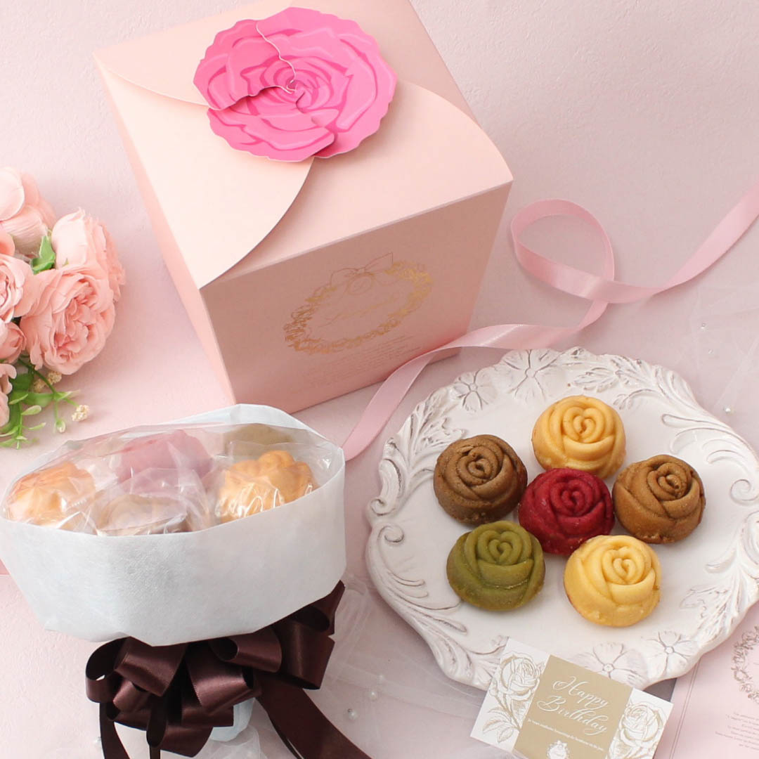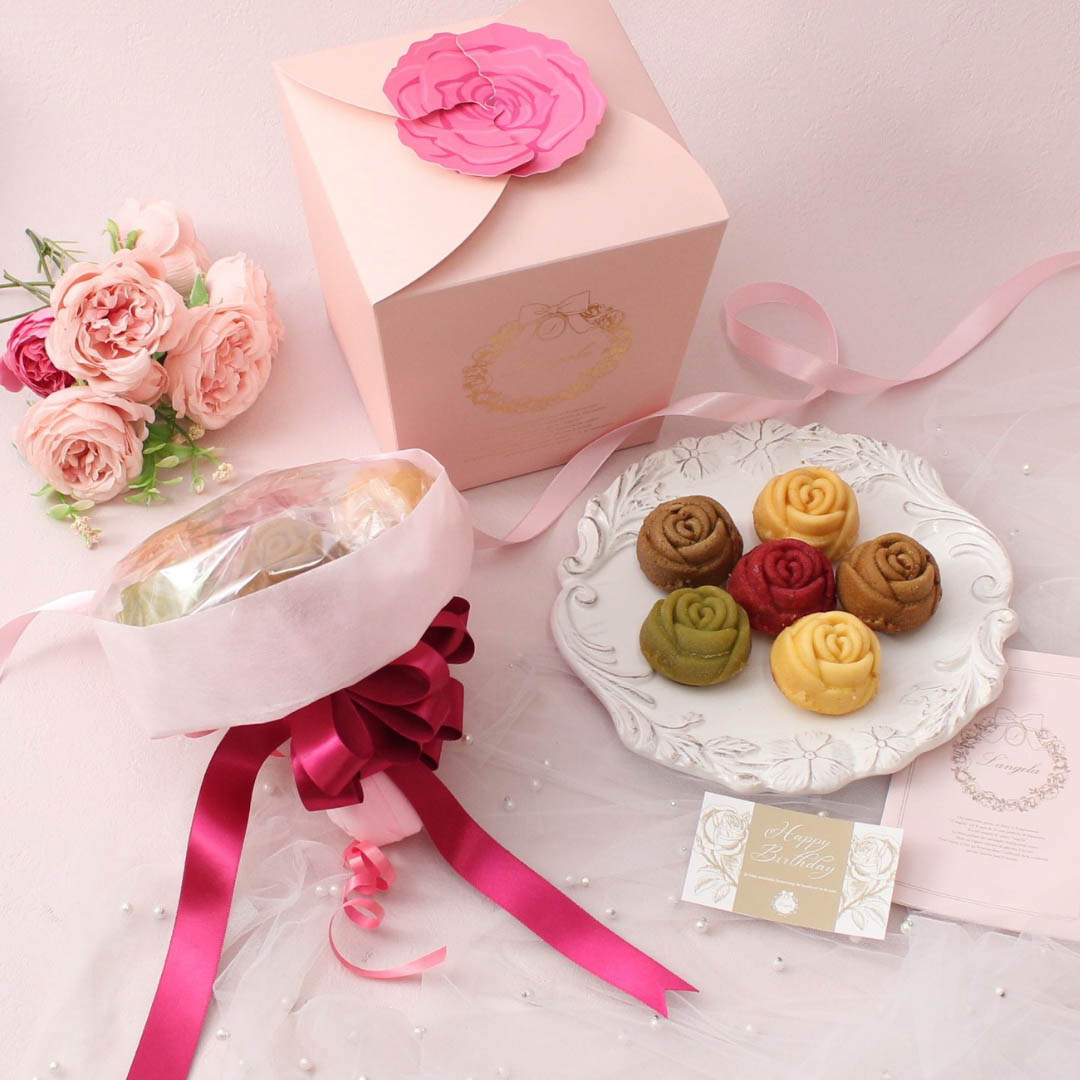 可愛らしいバラの形をしたマドレーヌのブーケです。 時間と手間をかけて作られた6種類の味をお楽しみいただけます! ブーケの形に包装されているので、様々なシーンでのプレゼントに活躍します。 特別なマドレーヌをプレゼントしてみてはいかがでしょうか。
