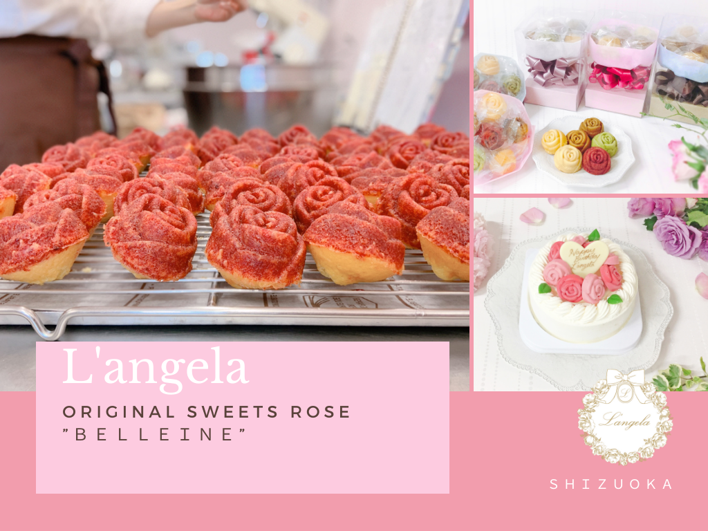 夢と憧れが詰まったパティスリー。【L'angela(ランジェラ)】は、パティシエールの大好きな薔薇の名称、“アンジェラ”から名付けられました。 子供の頃からの夢と、自分のパティスリーを持つことへの憧れ大好きな薔薇に囲まれる世界、そして地元富士市の花『バラ』との運命に、いつしか、バラのマドレーヌ作りに没頭する日々を過ごします。 素材に徹底的にこだわり、より美味しく、より美しくを探求する中、バラのマドレーヌが完成されました。焼きたての香りが広がる、お花に囲まれた空間で、誰もが笑顔になる【スイーツ界のお花屋さん】をめざします。