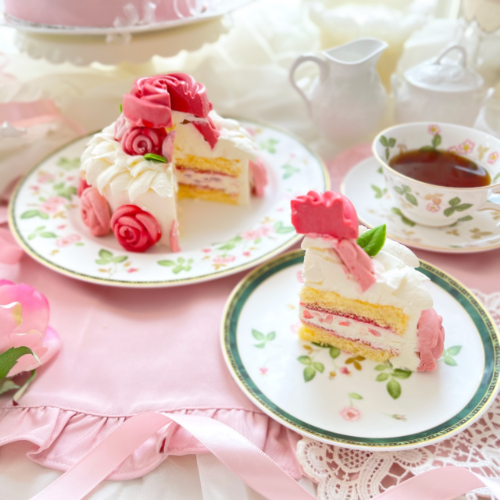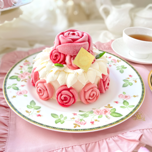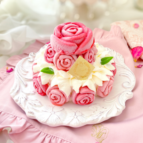 しっとりふわふわきめ細かいランジェラのスポンジケーキに、薔薇のムースを贅沢に飾りました。