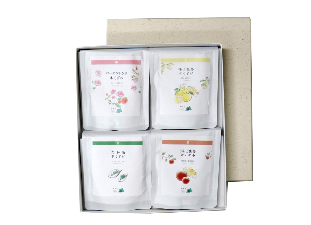 定番人気の「りんご生姜本くずゆ」、「柚子生姜本くずゆ」、「大和茶本くずゆ」、「ローズブレンド本くずゆ」の4種類です。