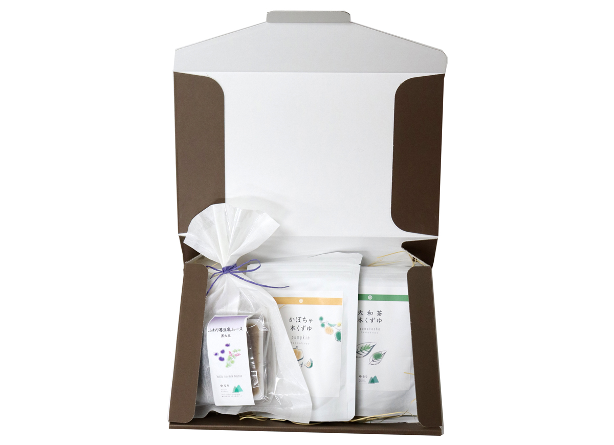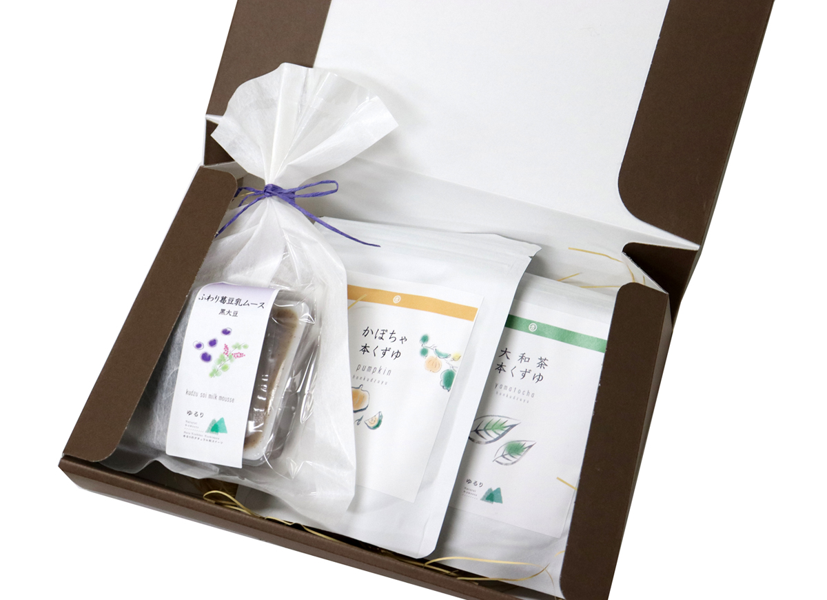 | 原材料 | かぼちゃ本くずゆ:砂糖(てんさい糖)、本葛(奈良県産)、かぼちゃ粉末(奈良県産)、玉あられ(餅米、水飴) 大和茶本くずゆ:砂糖(てんさい糖)、本葛(奈良県産)、大和茶粉末(奈良県産) 葛豆乳ムース)黒大豆):有機大豆(遺伝子組換えでない)、黒大豆きな粉(兵庫県産)、てんさい糖、本葛(奈良県産)、寒天 黒糖蜜:砂糖・果糖ぶどう糖液糖、黒砂糖、食塩/カラメル色素、増粘剤(キサンタン) |
